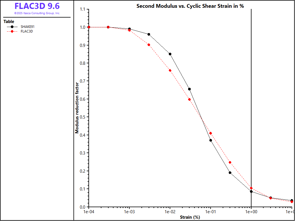 Figure 3: Modulus reduction curve for FLAC3D default model versus dynamic property set 1 (Seed & Sun data — clay — “upper range”).