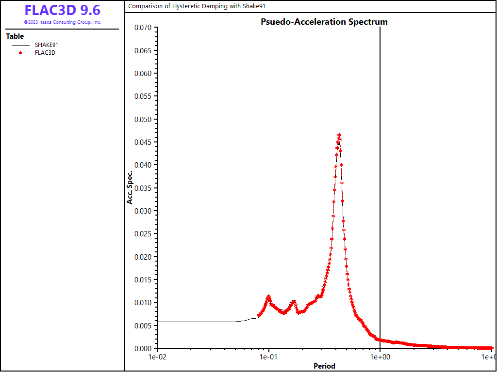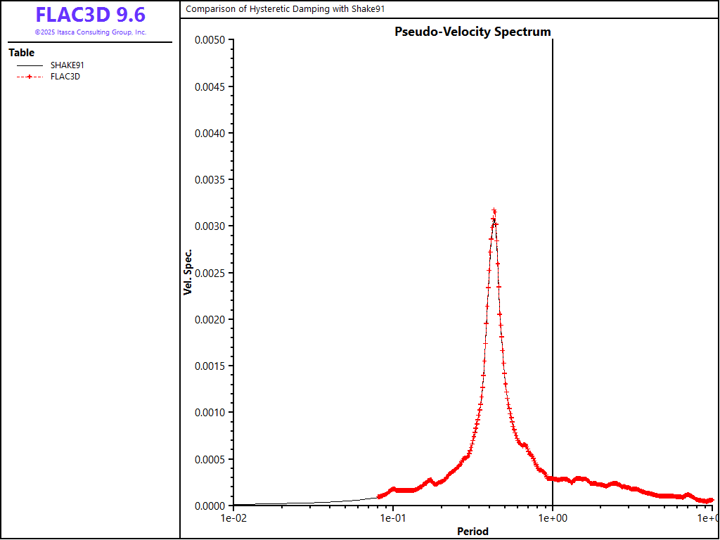 Figures 7 and 8 provide pseudo-acceleration and pseudo-velocity spectra, calibrated in SHAKE-91 and FLAC3D when the maximum input acceleration amplitude is small (0.0001 g). In SHAKE-91, the response spectra are calculated using option 9. In FLAC3D, response spectra are computed using a FISH function, spectra, implemented in file “spectra.dat”. Here the damping ratio, minimum period and maximum period of interest are 5%, 0.01 and 10, respectively. From these plots it can clearly be seen that the FLAC3D and SHAKE-91 results correspond quite closely for small-amplitude input motion.