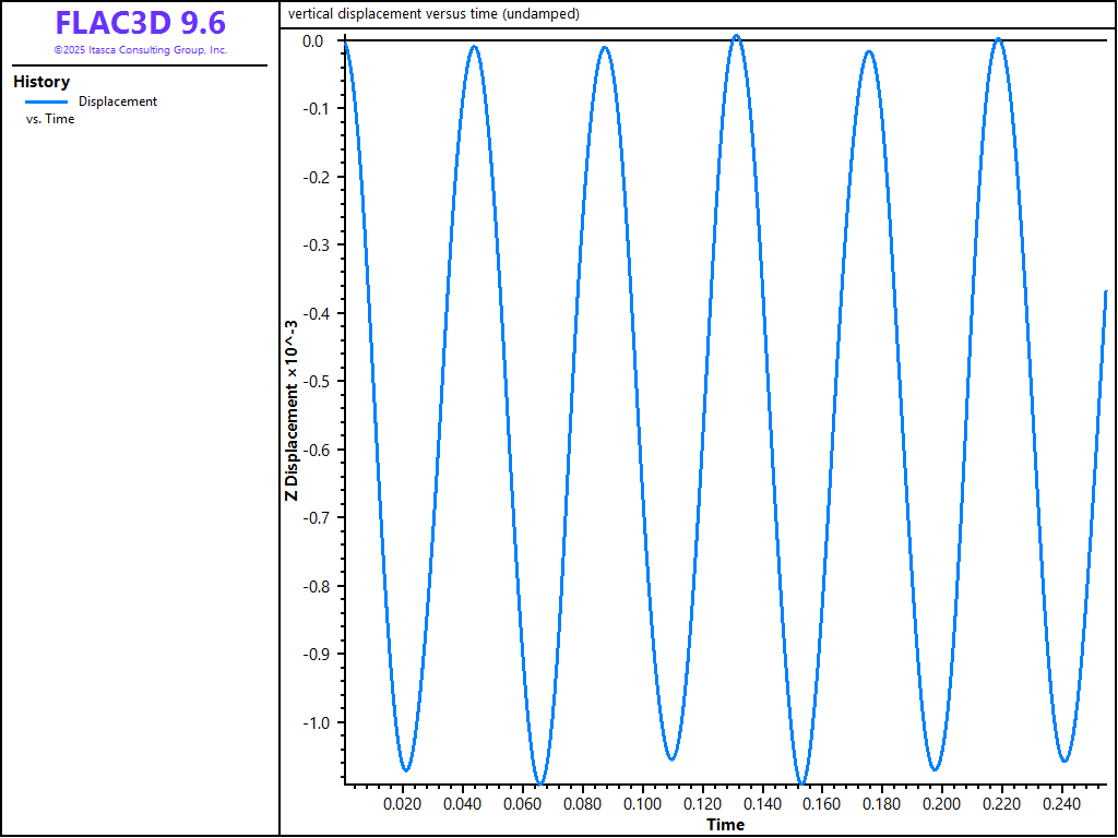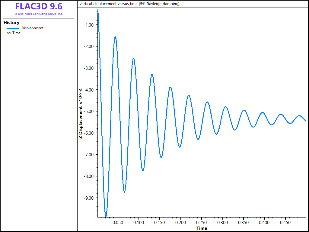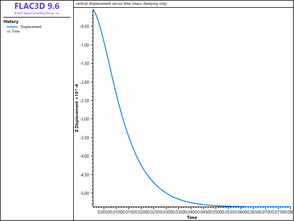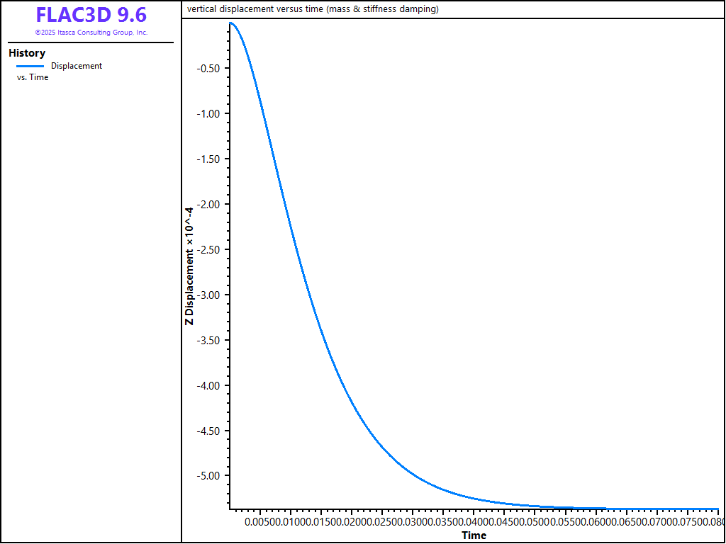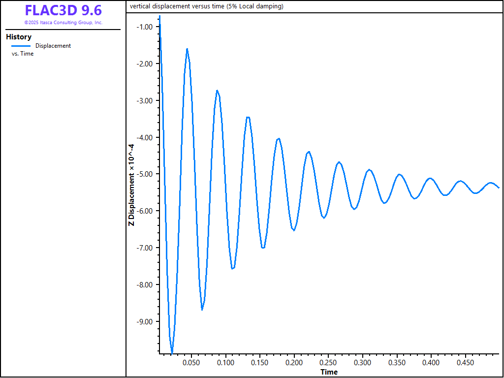 In order to demonstrate how Rayleigh and Local damping works in FLAC3D, the results of several damping cases can be compared. The example consists of a square grid in which gravity is suddenly applied. The conditions are: