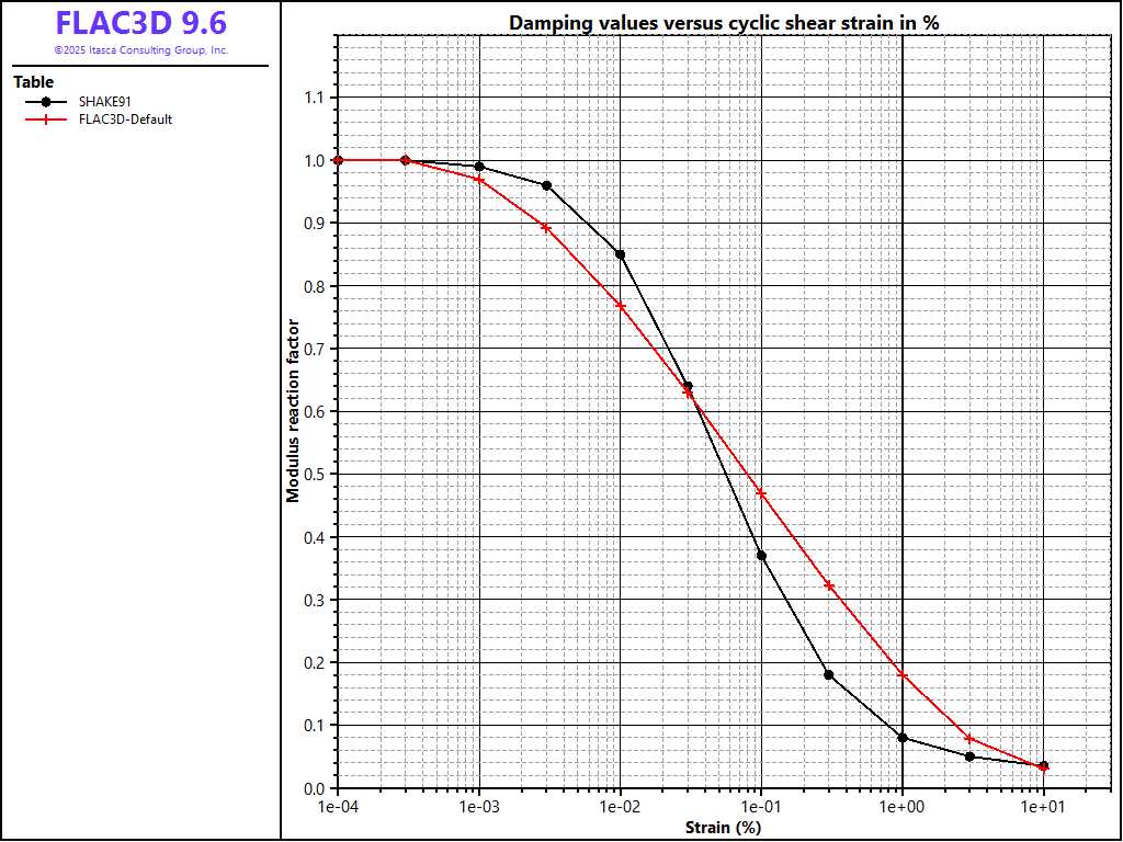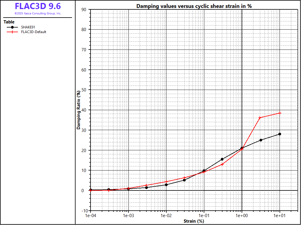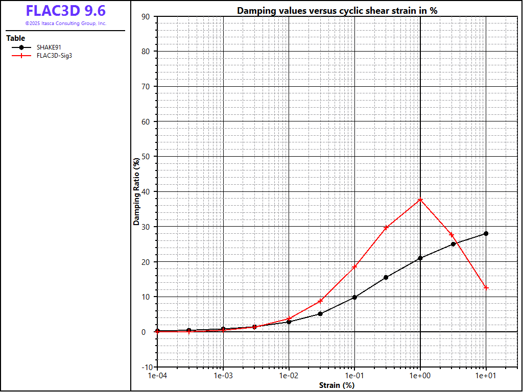 The results are summarized in Figures 1 and 2, which present the tangent modulus results and damping ratio results from FLAC3D together with the Seed & Idriss results. Although the modulus results match the target data well over five orders of magnitude (Figure 1), the measured damping does not conform well with the published damping curves for the same material over the same range (Figure 2).