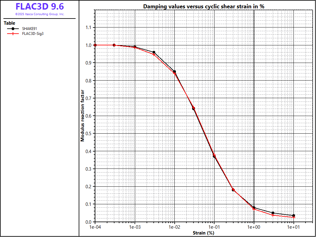 (corresponding to the strains being modeled). As an example of this strategy, the default model is used, giving the FLAC3D results shown in Figures 3 and 4. The hysteretic damping in this case was invoked with the command (see default parameters in Numerical Fits to Seed & Idriss Data for Sand)