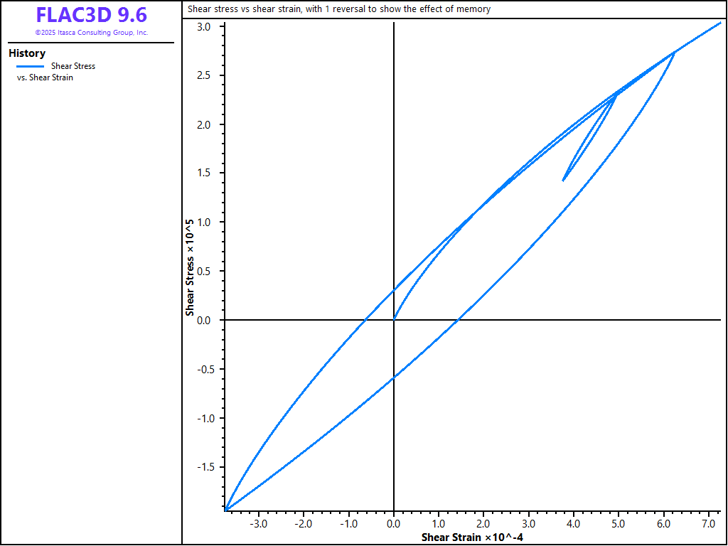 "Shear stress vs shear strain, with 1 reversal to show the effect of memory"