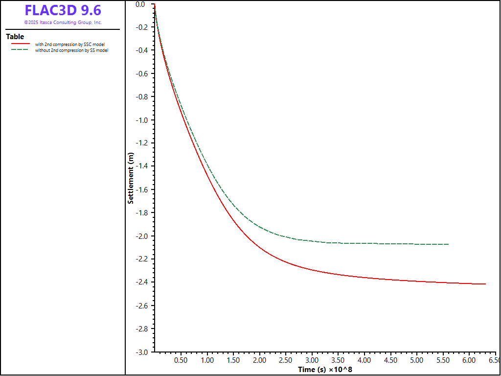 Figure 3 plots the vertical displacement (settlement) for 20 years. It is clear that the settlement is starting flatted to about 2.2 m from about 3.5 years if not considering the secondary compression, while the settlement is continuously increasing if considering the secondary compression.