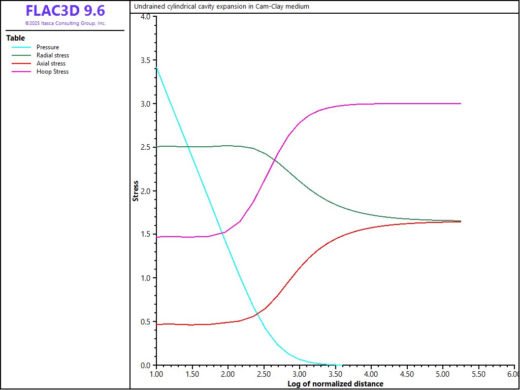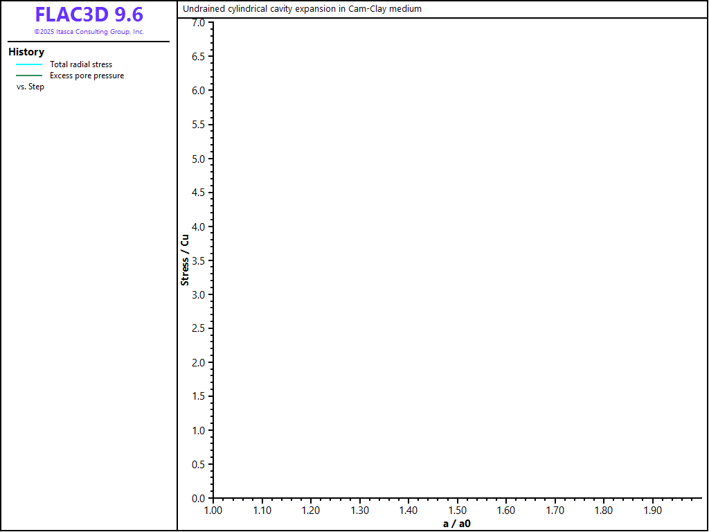 A compressive velocity of magnitude 10-5 is applied at the cavity boundary for a total of 100,000 steps, so that the cavity radius has doubled at the end of the pressure test. Stresses and pore pressure are monitored during the calculation.