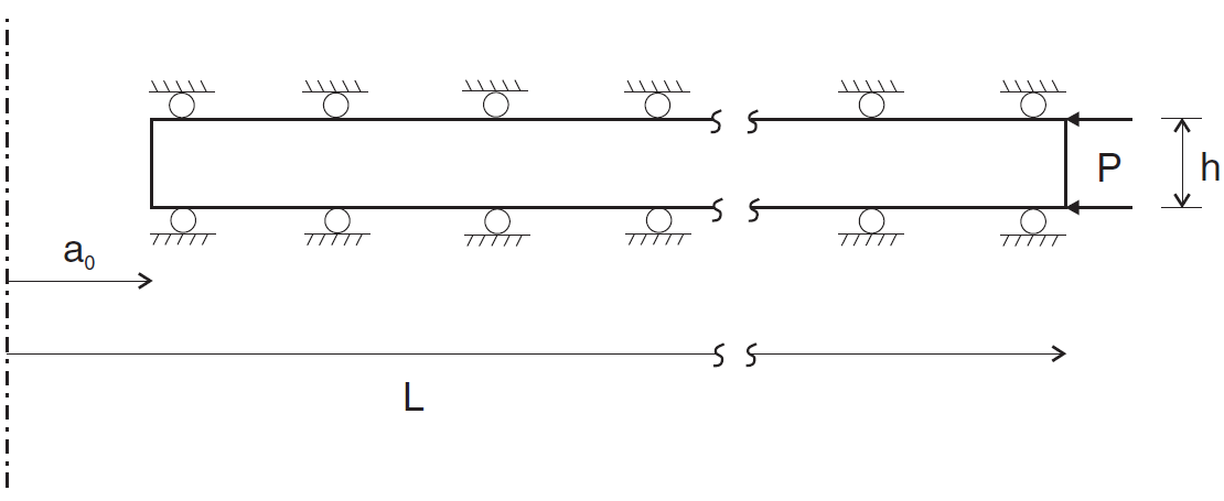 The dimensions of the FLAC3D grid correspond to dimensionless values \(a_0\big/a_0\) = 1, \(L\big/a_0\) = 200 and \(h\big/a_0\) = 1. The grid is composed of a single layer of 31 zones of constant height and variable zone width, graded by a factor 1.1 (see Figure 2), where the FLAC3D system of reference axes is also represented.