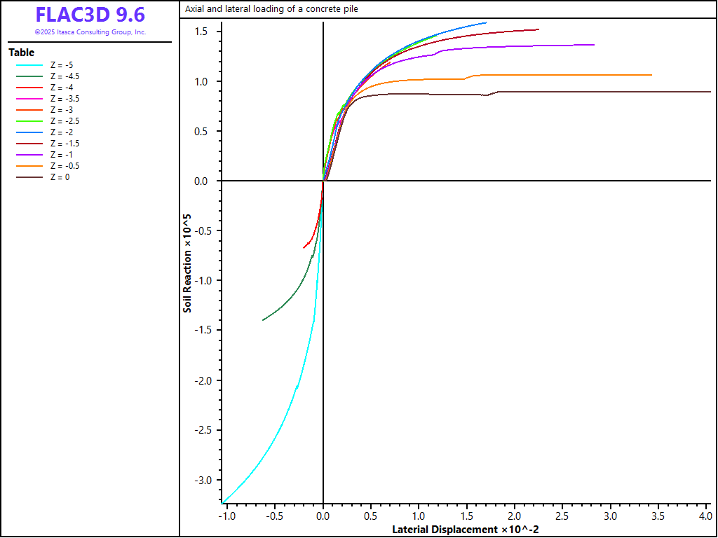 A FISH function, tot_reac in the file “p-y.dat” is used to monitor soil reaction along the pile as a function of lateral displacement. tot_reac creates tables of soil reaction (\(p\)) versus lateral displacement (\(y\)) at different locations along the pile in order to generate \(p-y\) curves. Calculated \(p-y\) curves are shown in Figure 6.