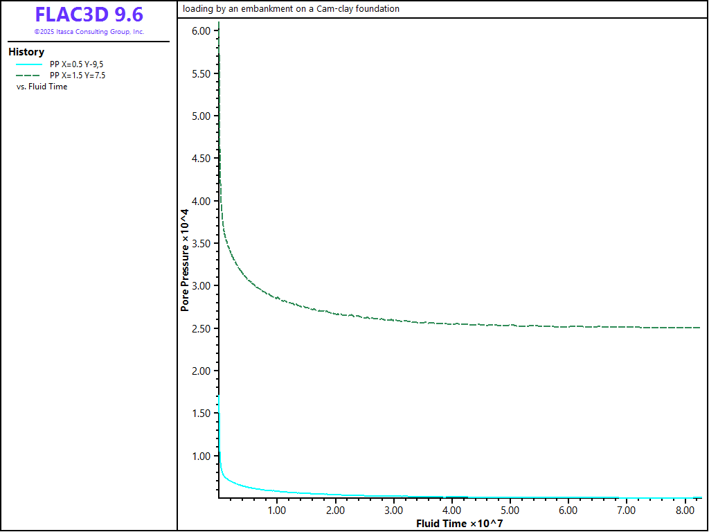In Figure 9, the graph of pore pressure evolution at two monitoring points confirms that a steady-state flow has been reached by the end of the drained simulation.