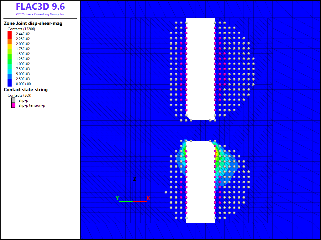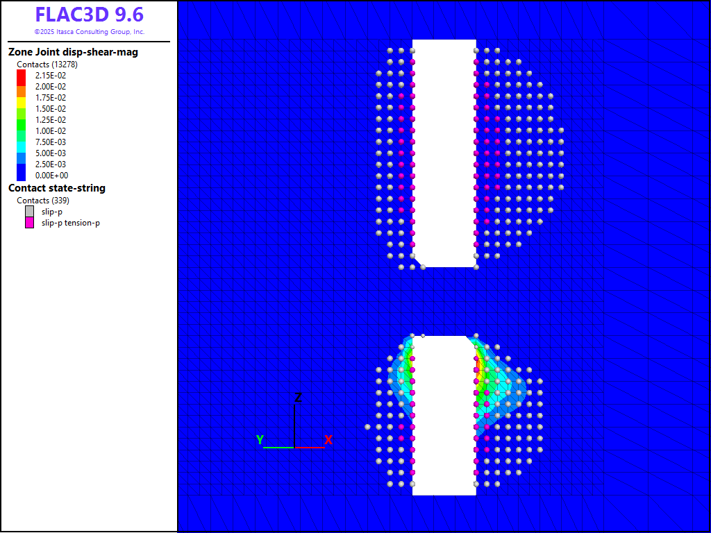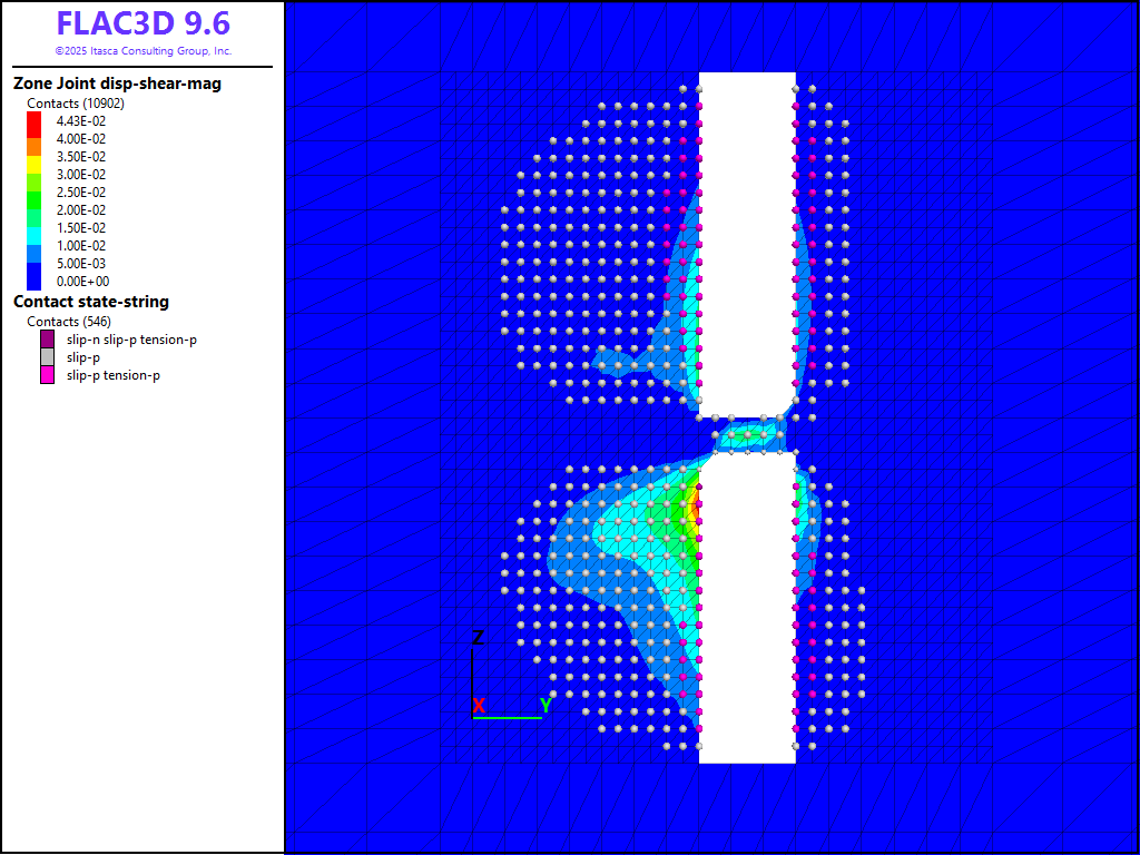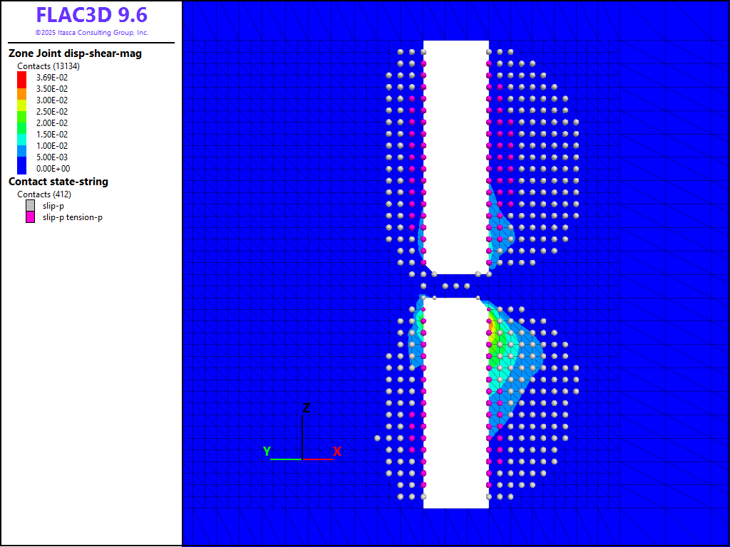 where \(G\) is the rock mass shear modulus, \(_s\) is the average slip and \(A\) is the area over which slip occurs. A FISH function is written to estimate the moment as shown in the data files below. It is assumed that the fault area includes all contacts that have slipped and the shear displacement is the average shear displacement of all contacts in the slipped area. Based on a rock-mass shear modulus of 9.9 GPa, an average slip of 1.2 cm, and a slip area of 1994 m2, a seismic moment of 2.4 × 1011 N-m is predicted.