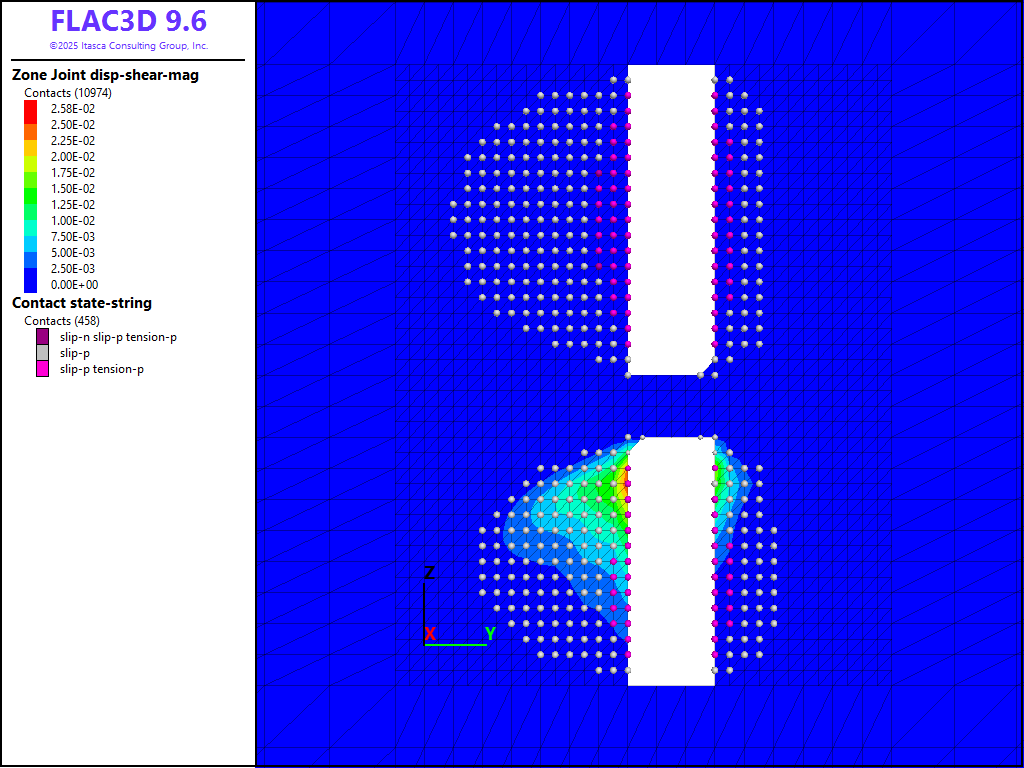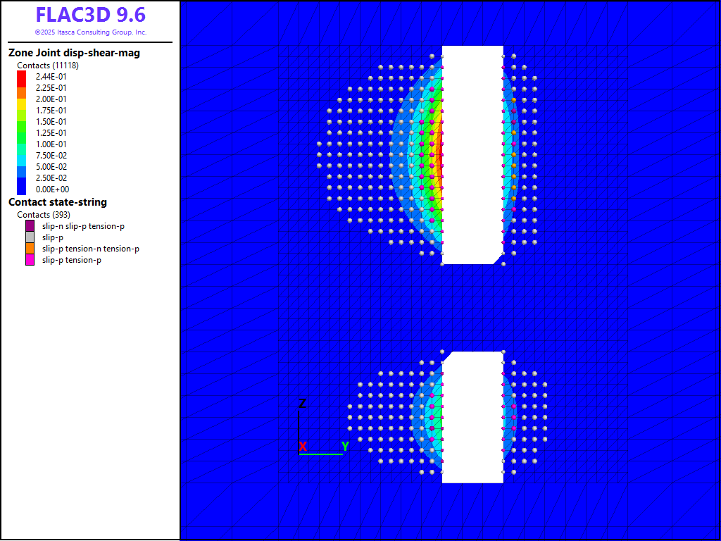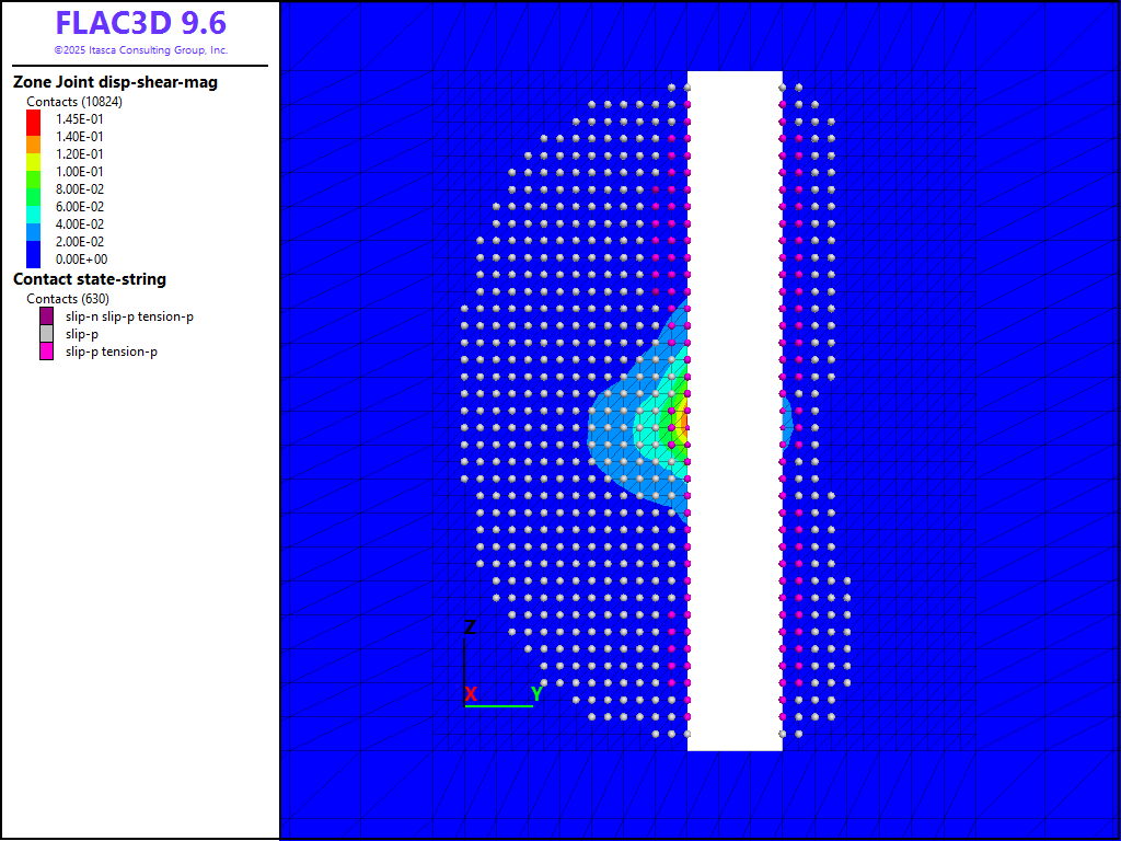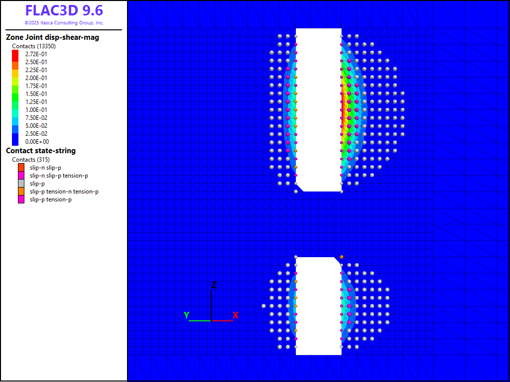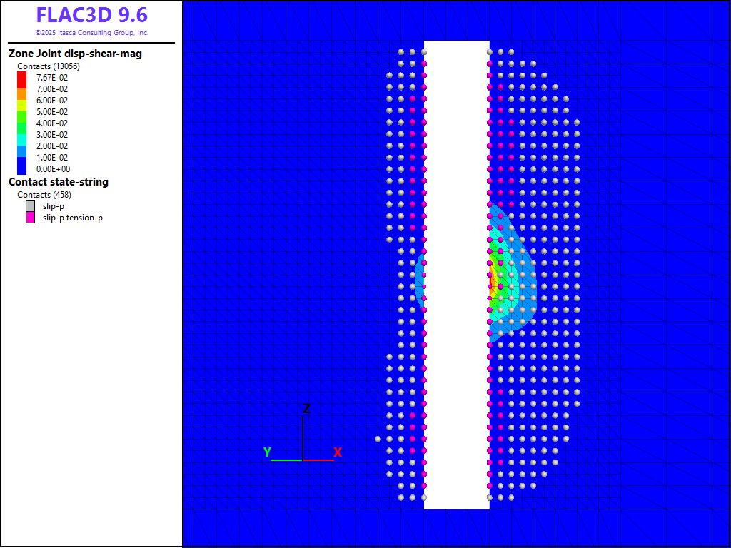 where \(G\) is the rock mass shear modulus, \(_s\) is the average slip and \(A\) is the area over which slip occurs. A FISH function is written to estimate the moment as shown in the data files below. It is assumed that the fault area includes all contacts that have slipped and the shear displacement is the average shear displacement of all contacts in the slipped area. Based on a rock-mass shear modulus of 9.9 GPa, an average slip of 1.2 cm, and a slip area of 1994 m2, a seismic moment of 2.4 × 1011 N-m is predicted.