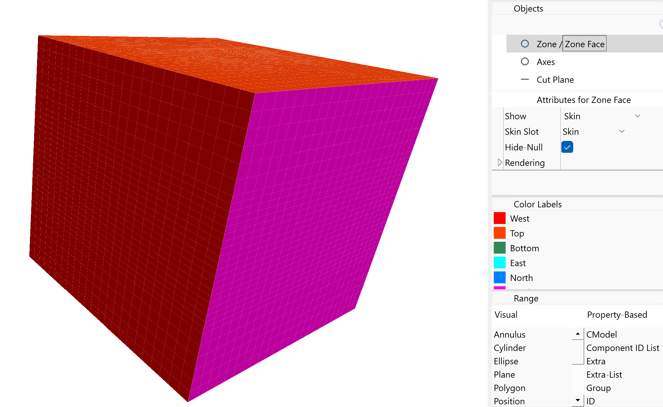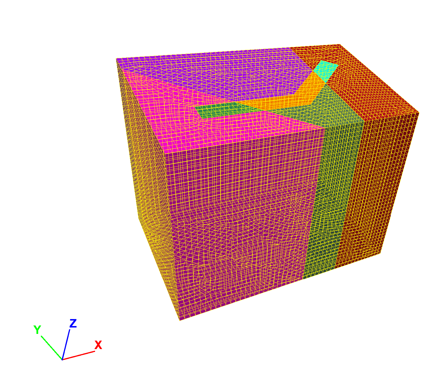 For the model, it will be desirable to densify zones in the area of interest. Before doing so, however, set the group names for faces on the surface to make it easy to apply boundary conditions later. Click the button to Assign group names to faces automatically. Check the box to ignore existing group names. Face groups should be automatically assigned as below.