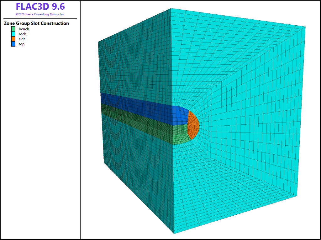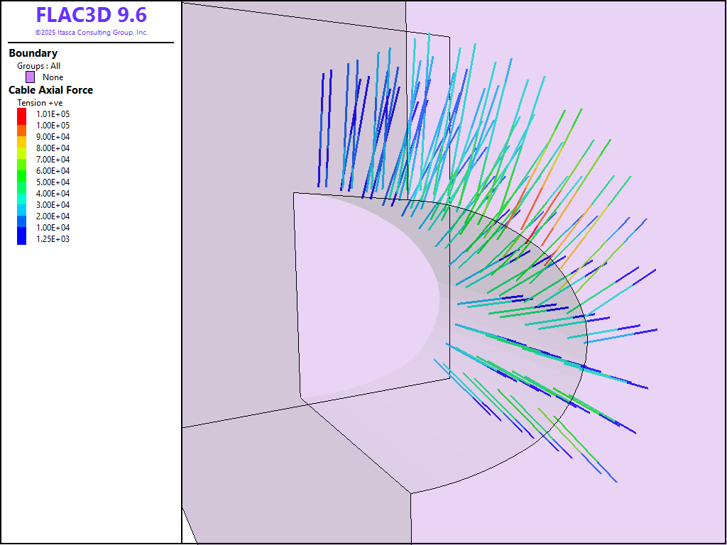 The first step of construction involves excavation to advance a portion of the tunnel face 1 m (side, top, or bench). No supports are installed during this step and the model is brought to equilibrium. At this state, the cable elements are installed with an offest of 0.5 m from the excavated face, representing the rockbolt support (pile structural elements more accurately model rockbolts, but these require more input parameters and the difference in results in this case is negligible). The locations of the rockbolts are defined by a Sketch set of the rockbolt pattern and the elements are created with the command structure cable import from-sketch. Alternatively, the rockbolt geometry can be imported into FLAC3D from DXF files.