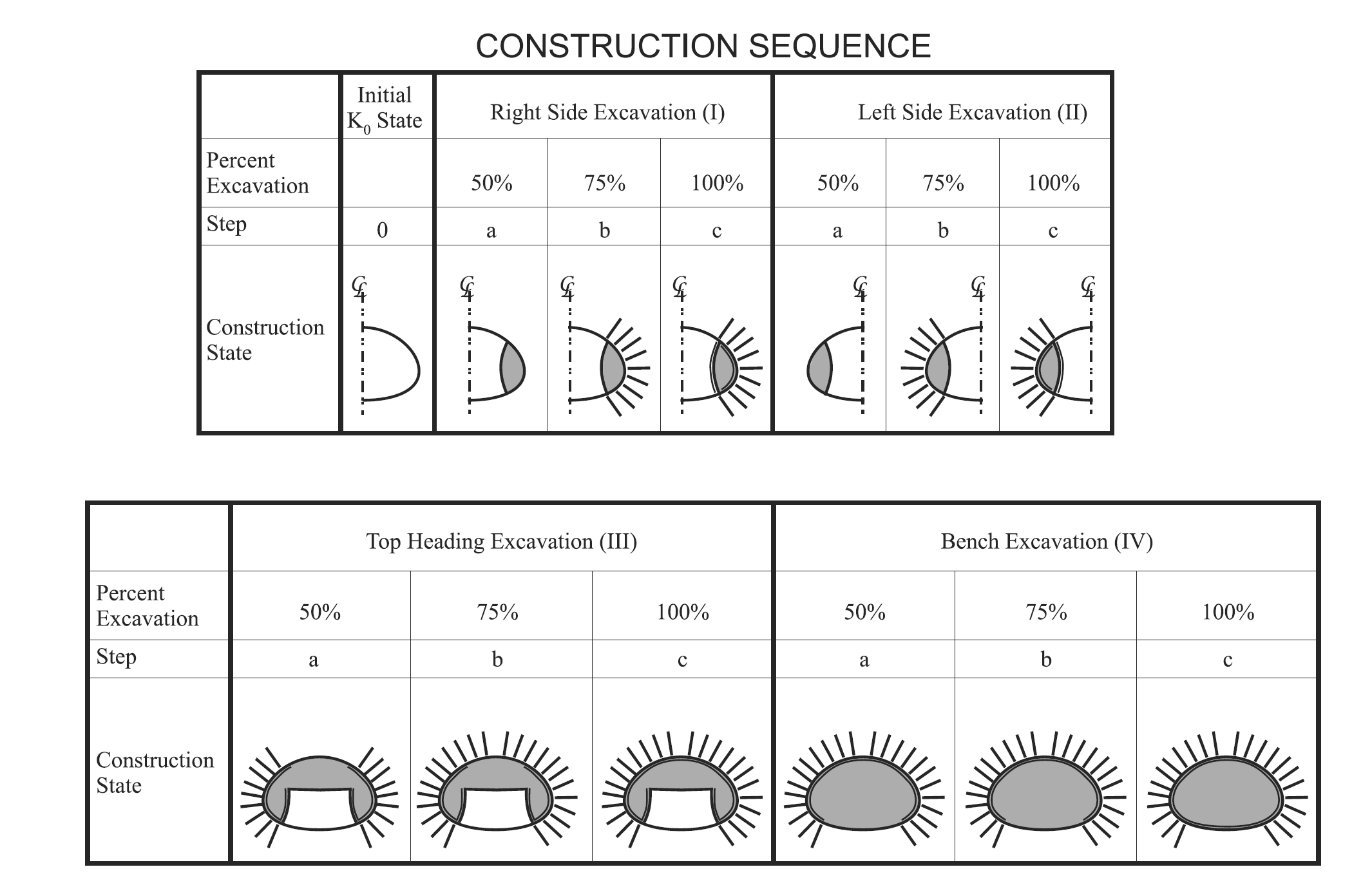 Figure 2: Construction sequence for a multistage tunnel excavation and support.