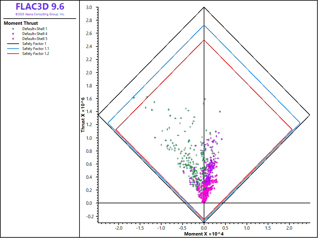 Figure 8 shows a moment-thrust diagram for the shell elements (shotcrete lining) after the final excavation stage. To create this figure, the strength properties of the shell need to be specified under the Property attribute for the plot item. Use these values to create the plot shown: