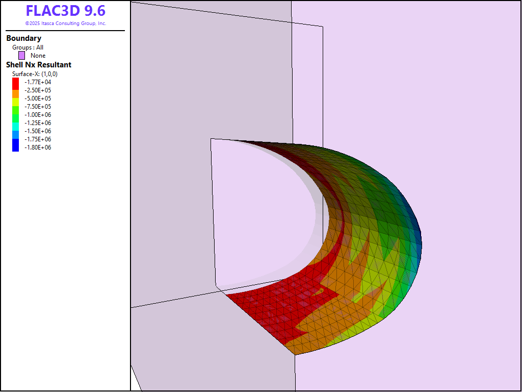 Figure 7: Final axial stress resultants in shotcrete lining (shells).
