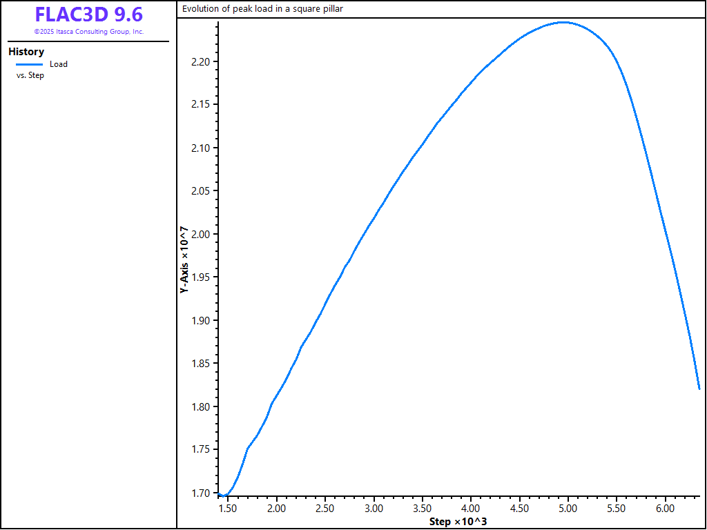The boundary conditions for the initial response are roller boundaries along the sides and bottom of the model, and an applied vertical stress of 17 MPa at the top of the model. In order to establish the peak load the pillar can carry, the vertical velocity of the top of the model is fixed at a constant value of -4 × 10-6 m/step. The sum of the reaction forces at the base of the model is obtained via the FISH function s_base.