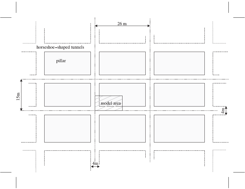 The mine layout shown in Figure 1 is representative of the production level in a mass-caving mining operation. The roadways are usually developed ahead of the mining and are initially subjected to the in-situ stress state. As mining progresses, the pillars are submitted to an increased vertical load.
