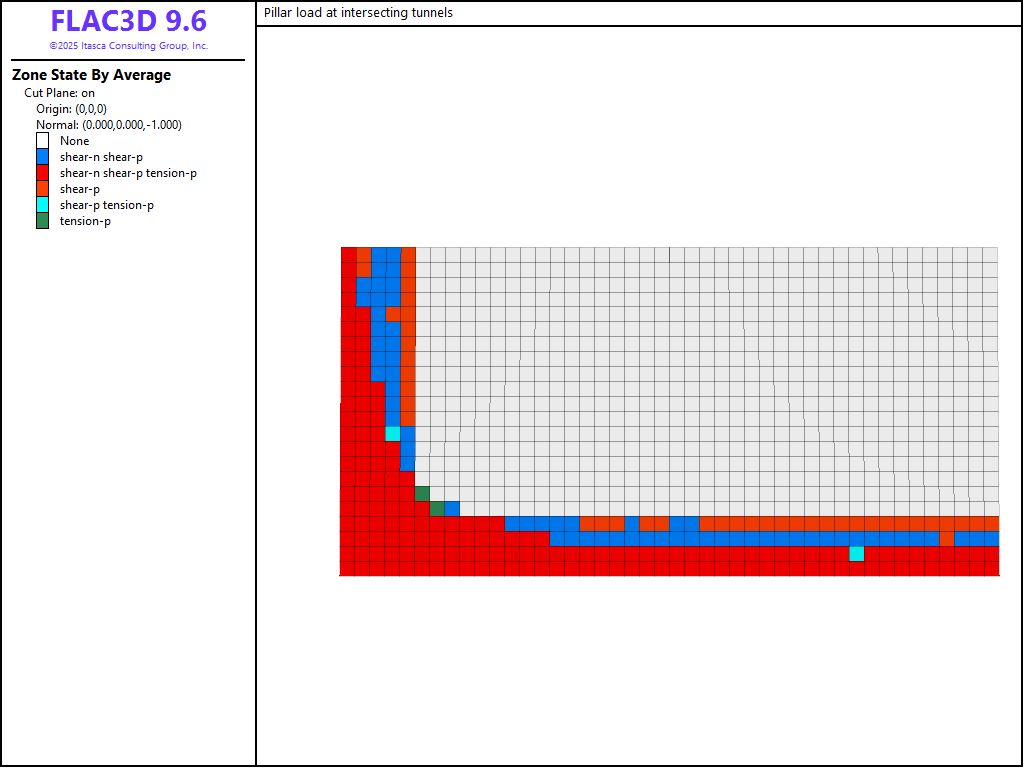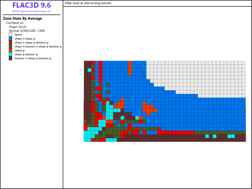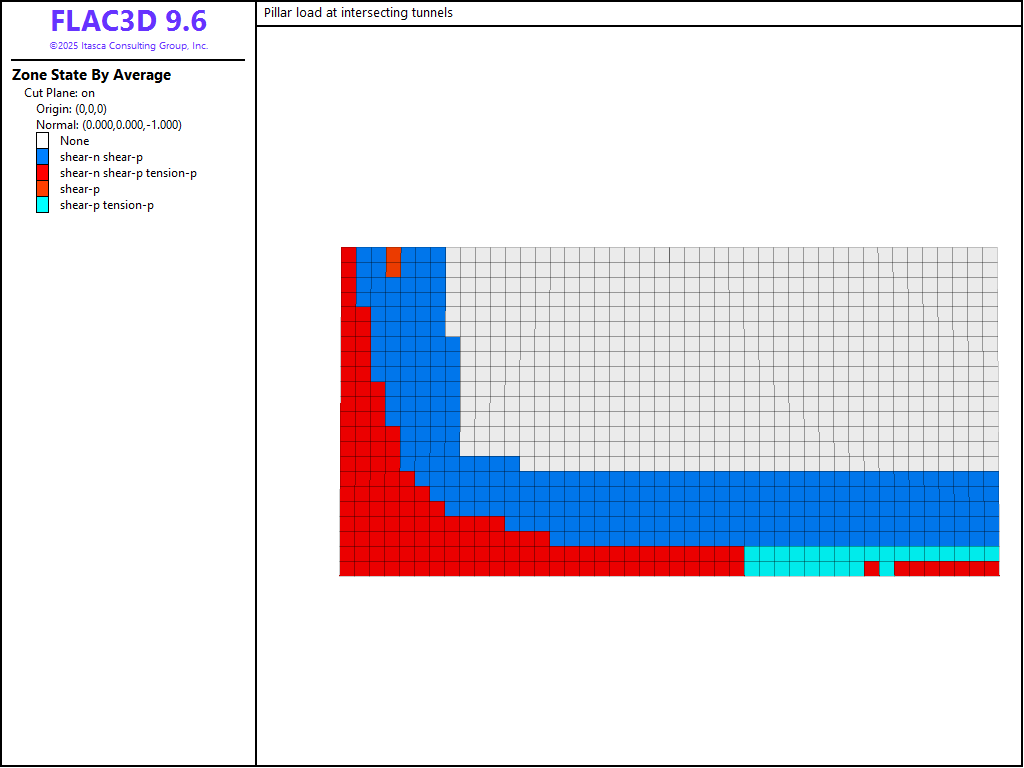 Figure 4: Plasticity state at pillar mid-height after excavation of tunnels.