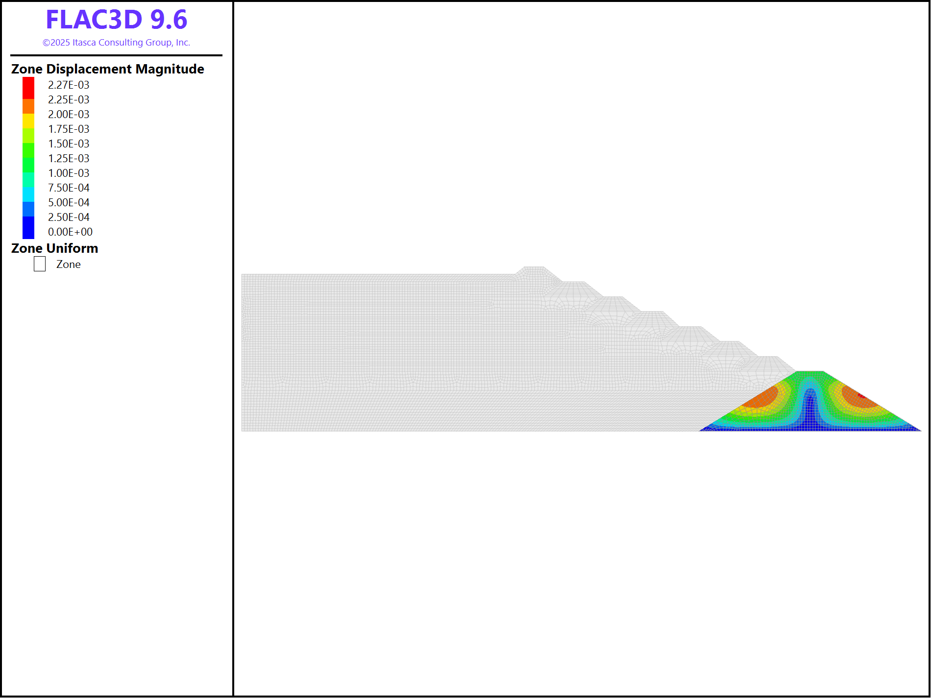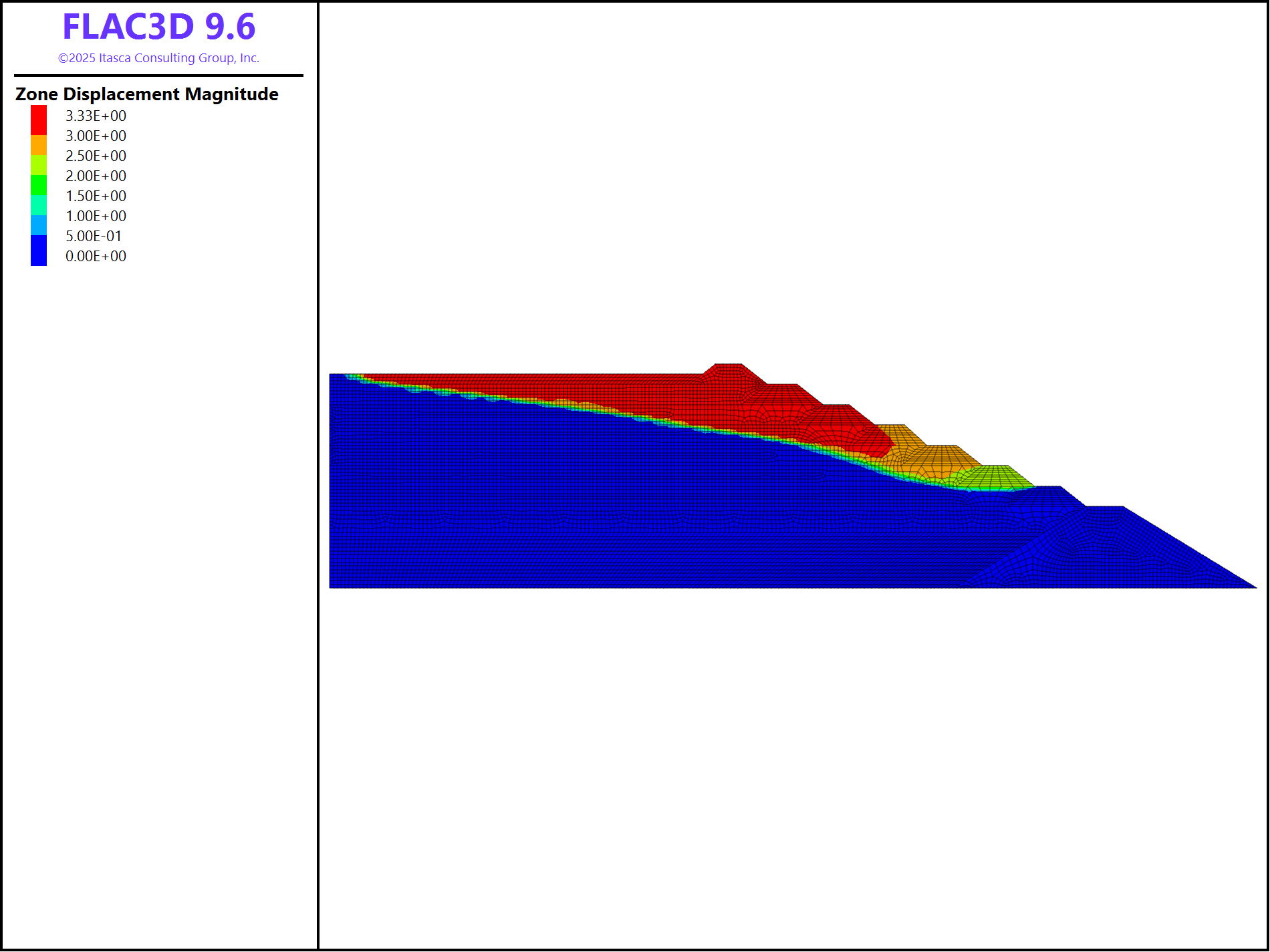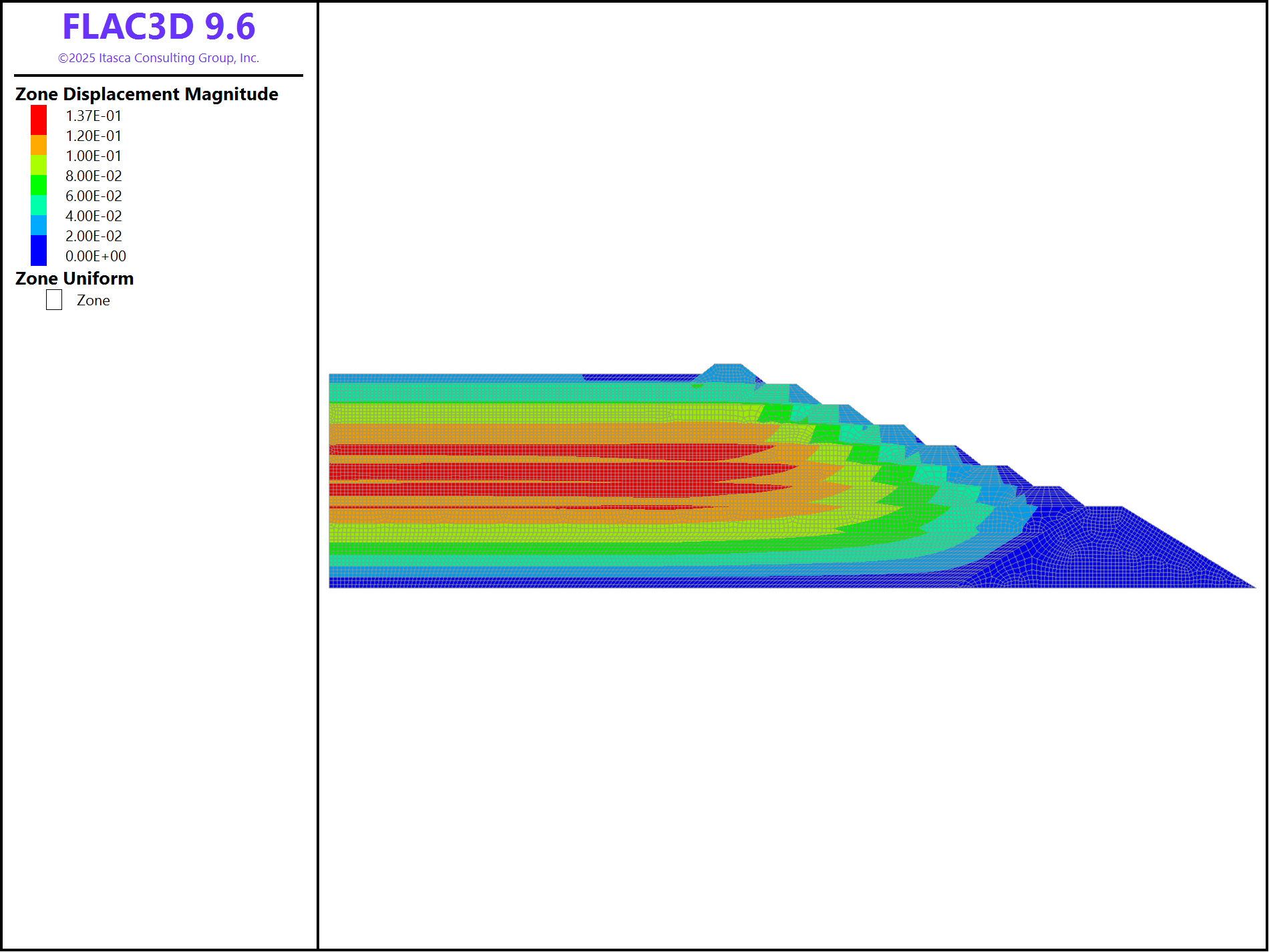 For tailings and dikes, similar procedures can be adopted. Alternatively, a FISH function called “add_layer” is used for this purpose. The construction sequence is “StarterDam”, “Talings01”, “Talings02”, “Talings03”, “Dike1”, “Taings04”, “Dike2”, “Tailing05”, “Dike3”, “Tailing06”, “Dike4”, “Tailing07”, “Dike5”, “Tailing08”, “Dike6”, “Tailings09”, “Dike7”, and “Tailings10”. For example, Figure 4 shows the displacement contour after construction of Dike3.