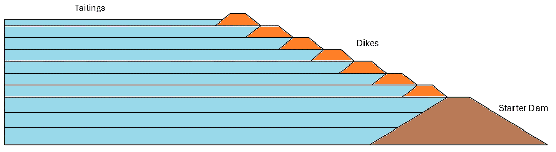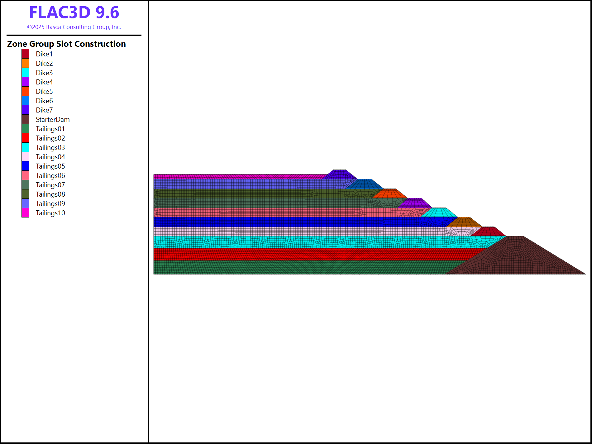 The model includes three basic materials: the starter dam, dikes, and tailings. The profile is shown in Figure 1.