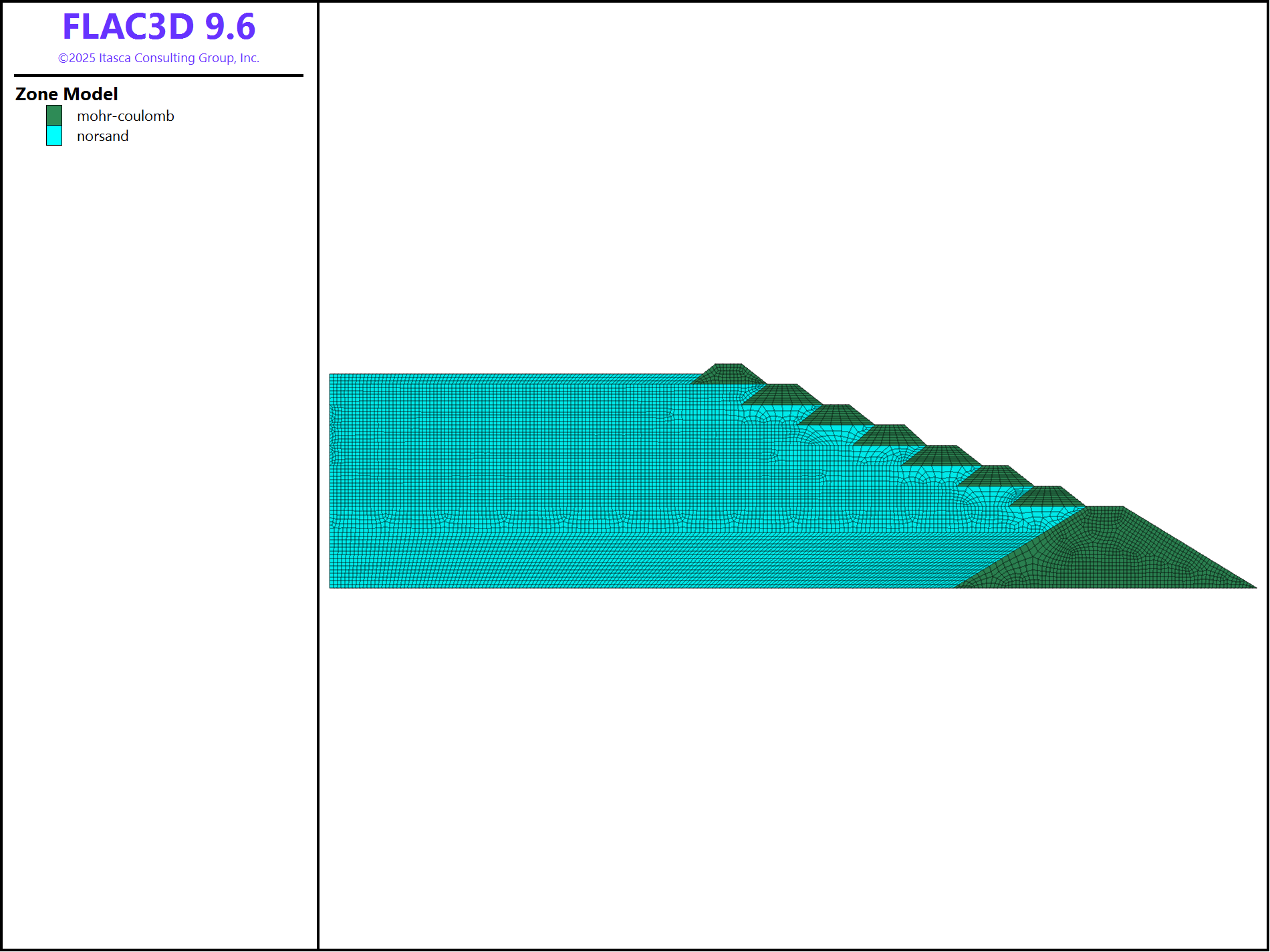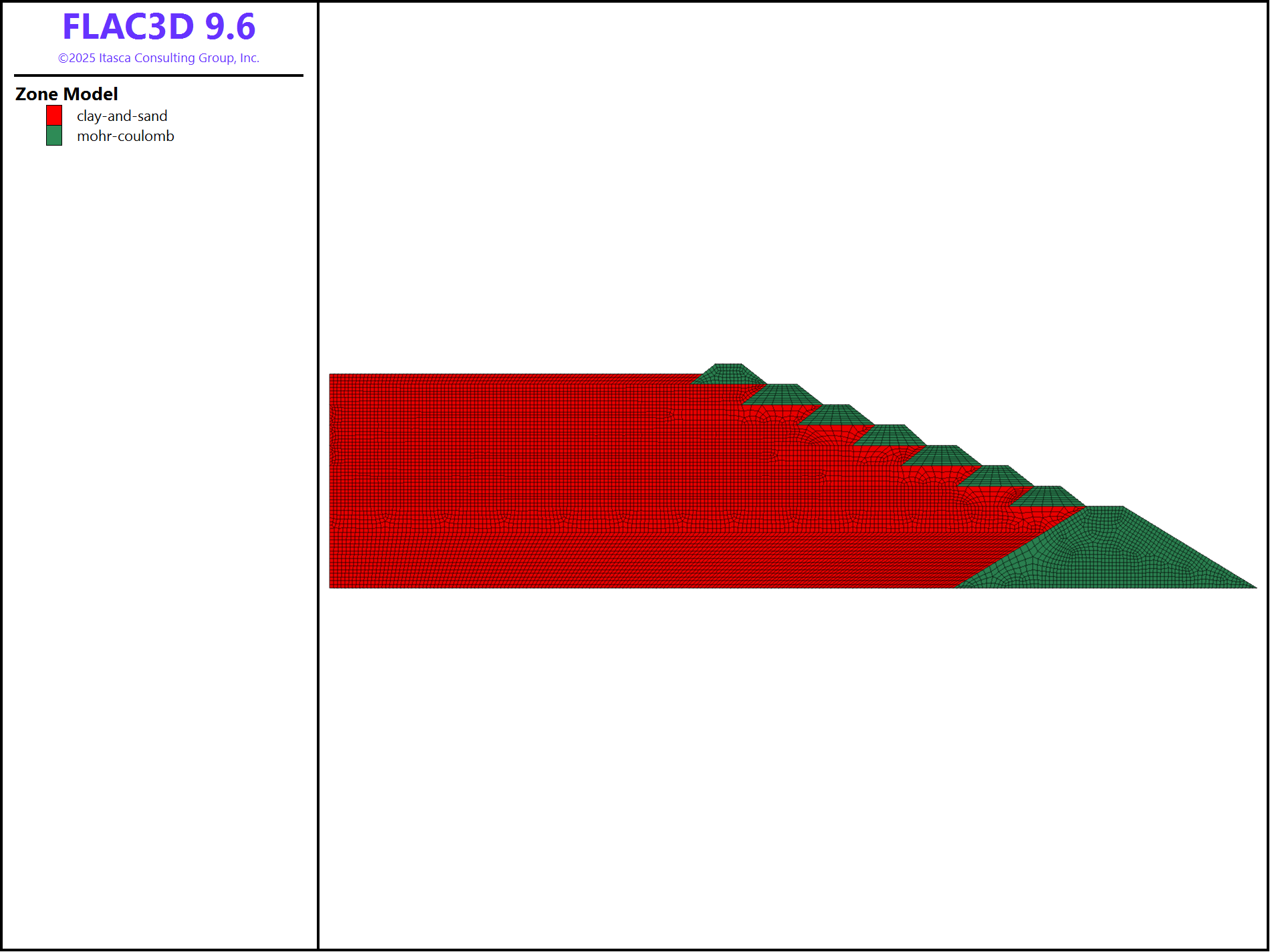 The staged construction is simulated by reassigning the nulled zones to non-null materials. In this example, for simplicity, all materials are assumed to follow the Mohr-Coulomb model during the construction.