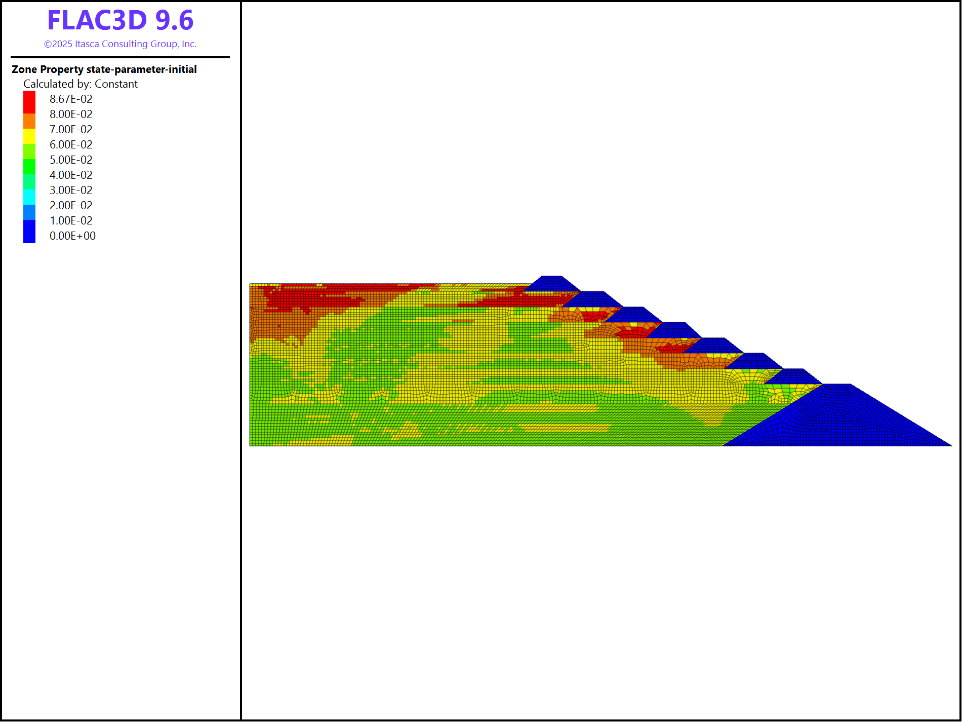 The starter dam is constructed first by assigning the “StarterDam” group to the Mohr-Coulomb model and setting the material properties. The command zone initialize-stresses is used to initialize the vertical stress to be gravitational and the horizontal stress to be a factor of the vertical stress. Use the command model solve-static convergence 1 to cycle through each staged construction.