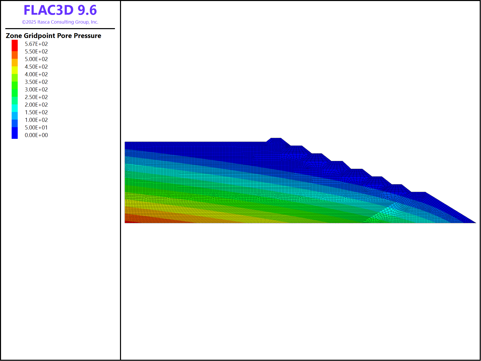 The fluid boundary conditions assume a fixed water table at the ground level on the “west” side and zero pore pressure at the top surface. Because the model base is at zero elevation (datum = 0), hydraulic head of 57.75 m is applied on the “west” side.