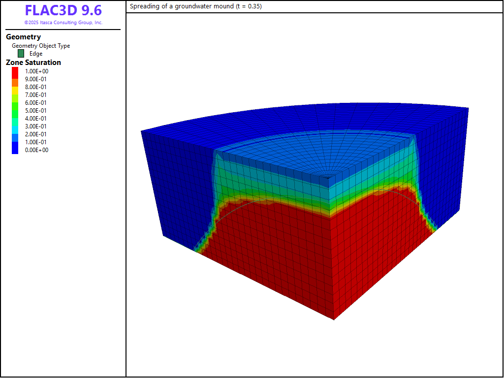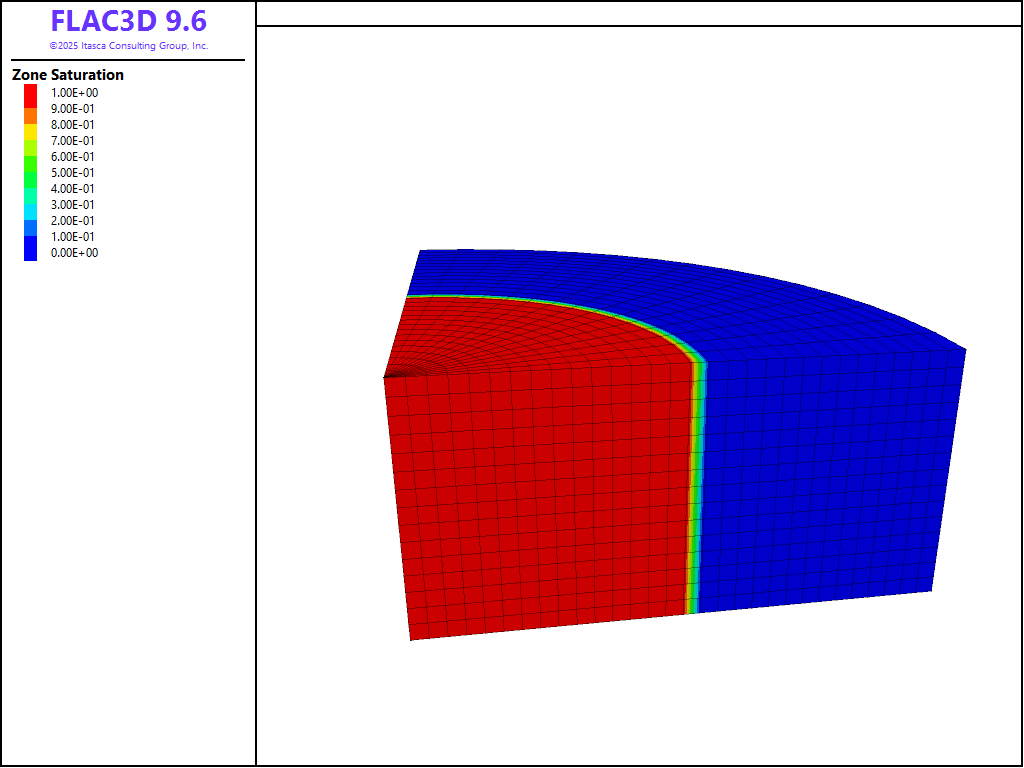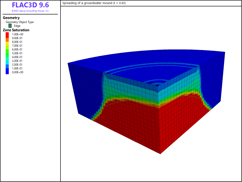The results are presented in dimensionless form: the scaled geometrical parameters \(r_{0}\) = 1, \(h_{0}\) = 1 are used, and the scaled water properties \(k\) = 0.5 × 10-4, \(\rho _{w}\) = 103, and \(n\) = 0.5 are prescribed in the numerical simulation. To model incompressible flow, the bulk modulus of the fluid, \(K_{f}\), is given a value that is large compared to the pore-pressure variations in the simulation (\(K_{f}\) = 2 × 105); the value \(g\) = 10 is used for gravity. The FLAC3D grid corresponds to a quarter cylinder and contains 2000 zones (see Figure 1). The radius of the model is 2, and its height is 1 unit. The initial saturation is 1 within the mound (radius = 1 unit, height = 1 unit), and zero outside. The initial pore-pressure distribution within the mound is hydrostatic. All boundaries are impermeable by default. As time goes on, the mound spreads out under its own weight. The simulation is conducted for a total dimensionless time value of \(\hat{t}\) = 0.85, with intermediate results at \(\hat{t}\) = 0.35, 0.45 and 0.65.