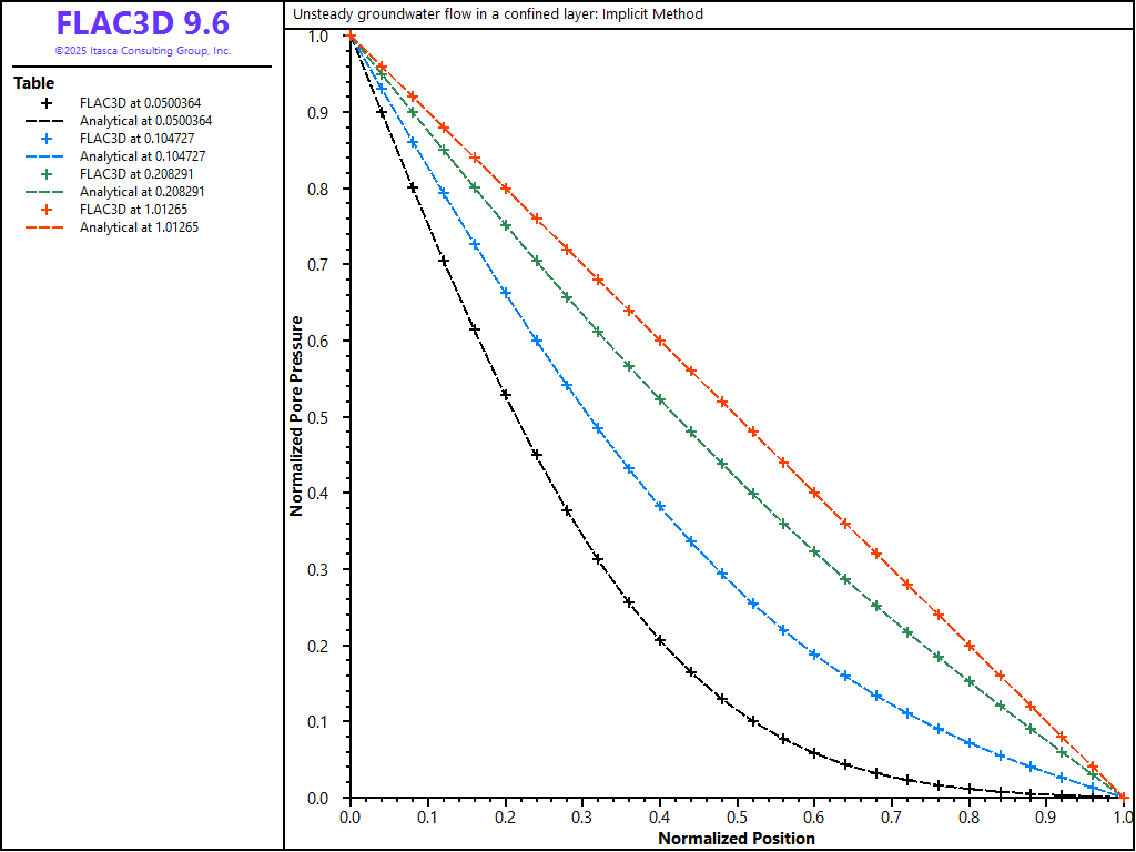 The analytical solution is programmed as a FISH function for direct comparison to the numerical results at selected fluid-flow times corresponding to \(\hat{t}\) = 0.05, 0.1, 0.2 and 1.0. The analytical and numerical pore-pressure results for these times are stored in tables.