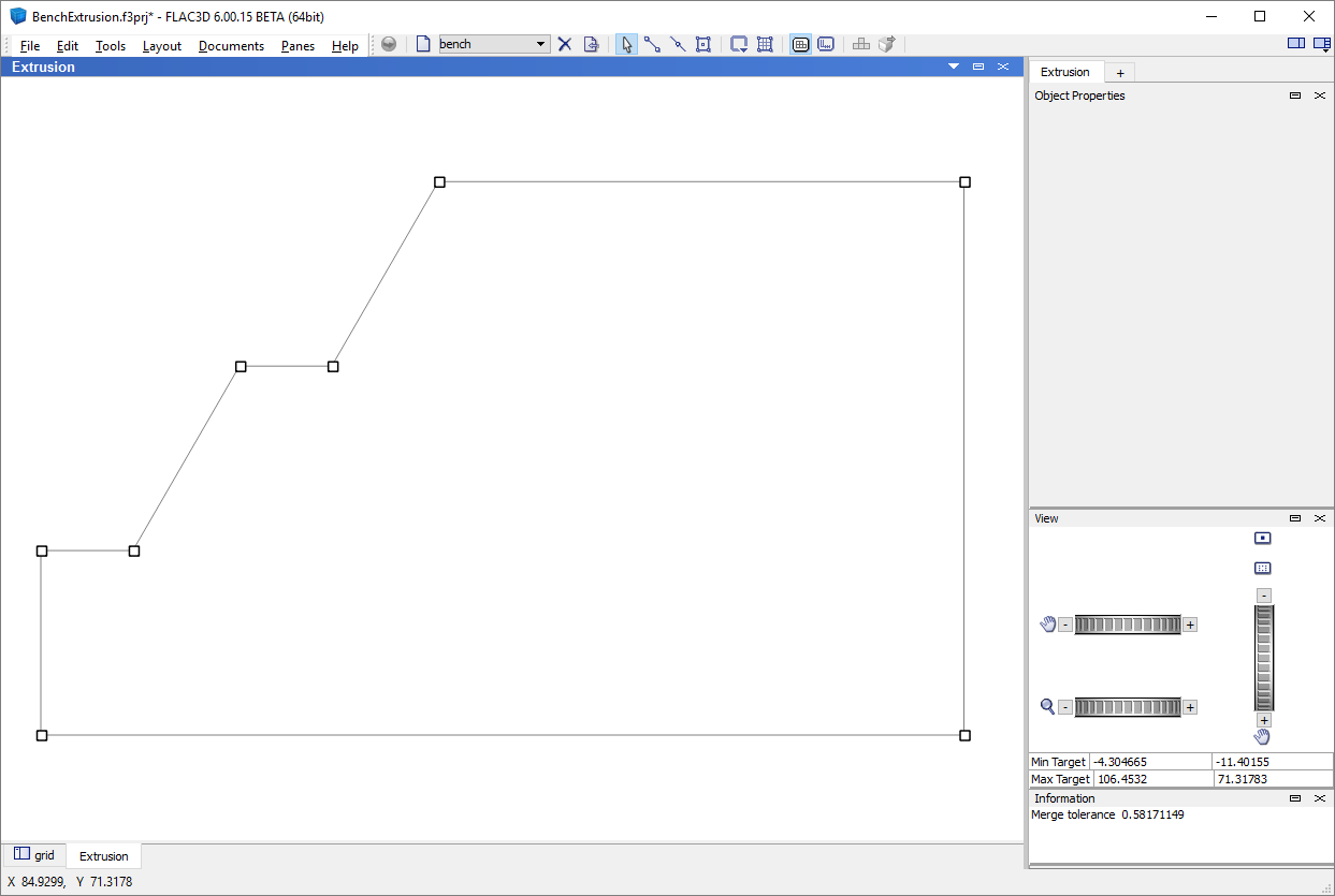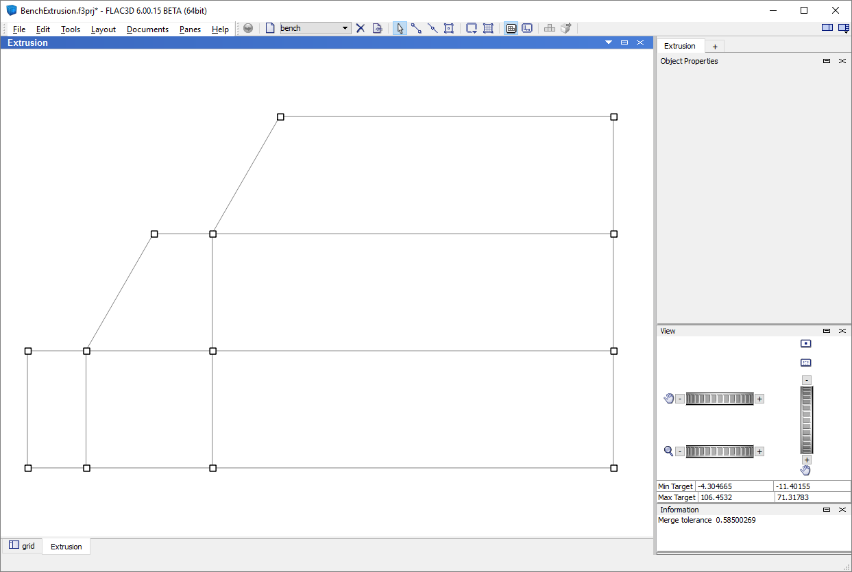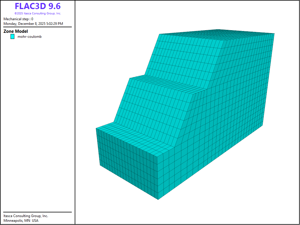 The extruded model is shown in Figure 7. The mesh in this model is relatively coarse for this illustrative example. The zoning can easily be changed by returning to the Sketch pane. The input record for this extrusion model is saved from the State Record pane in FLAC3D. The record is named “benchextude.dat”.