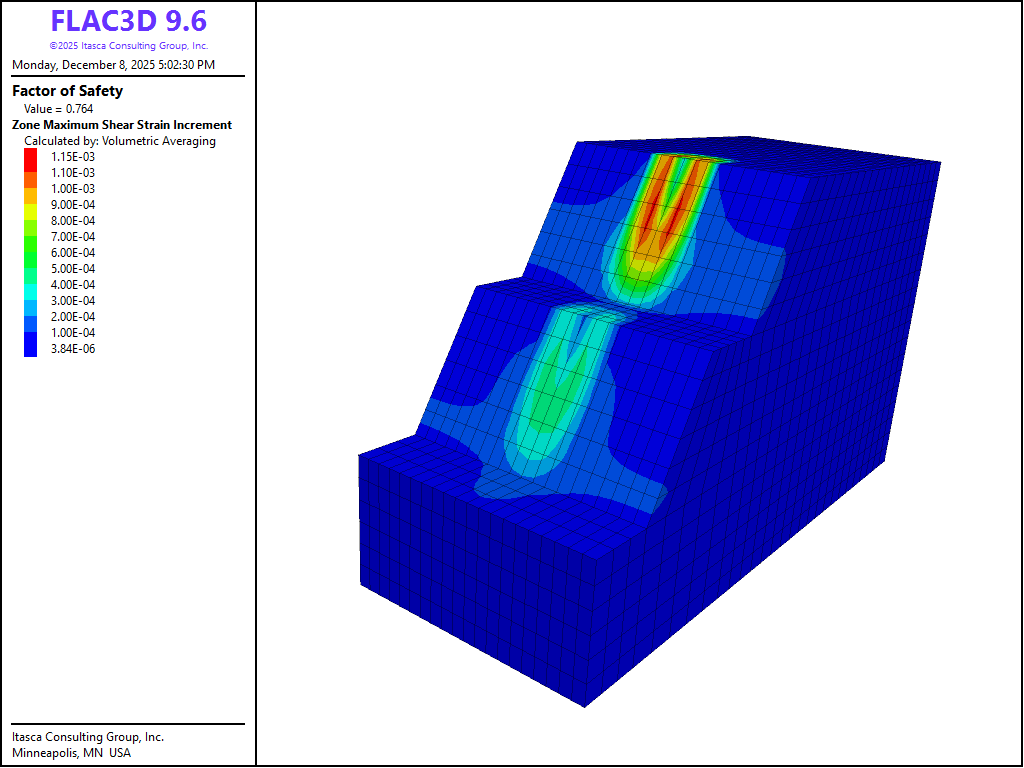 The FISH function in “benchAdjust.dat” could easily be extended to allow for the adjustment of the upper- and lower-bench slope angles independently and the adjustment of the bench width. Additional runs can then be made to evaluate the effect of variation in these variables on safety factor. (Note that the model boundary is not changed in this illustrative exercise, which limits the range of reduction of the slope angle.)
