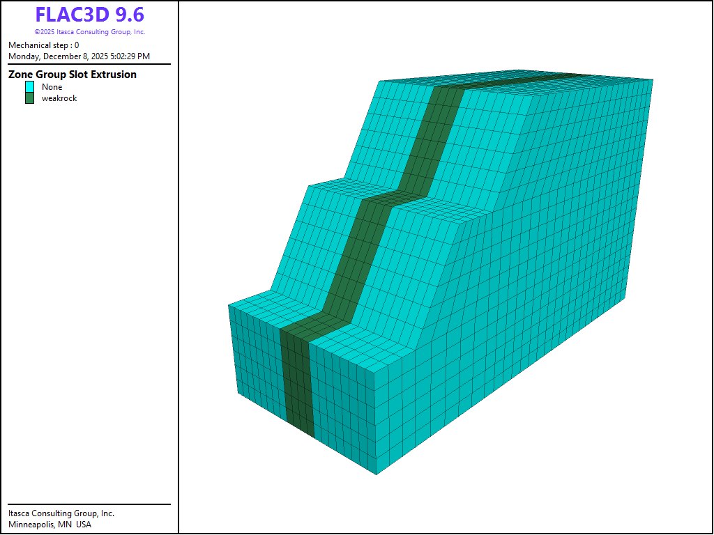 Figure 7: FLAC3D model of a benched slope in rock with a weak vertical band.