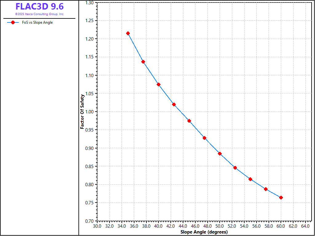 A total of 11 factor of safety calculations are performed as the slope angle is reduced from 60° to 35°. A table plot of factor of safety values versus slope angle can be displayed during the calculations to monitor the effect of slope angle on safety factor. A plot of the table at the completion of the calculations is shown in Figure 8. From the table, the critical slope (the slope when the factor of safety is 1.0) is approximately 43.5°.