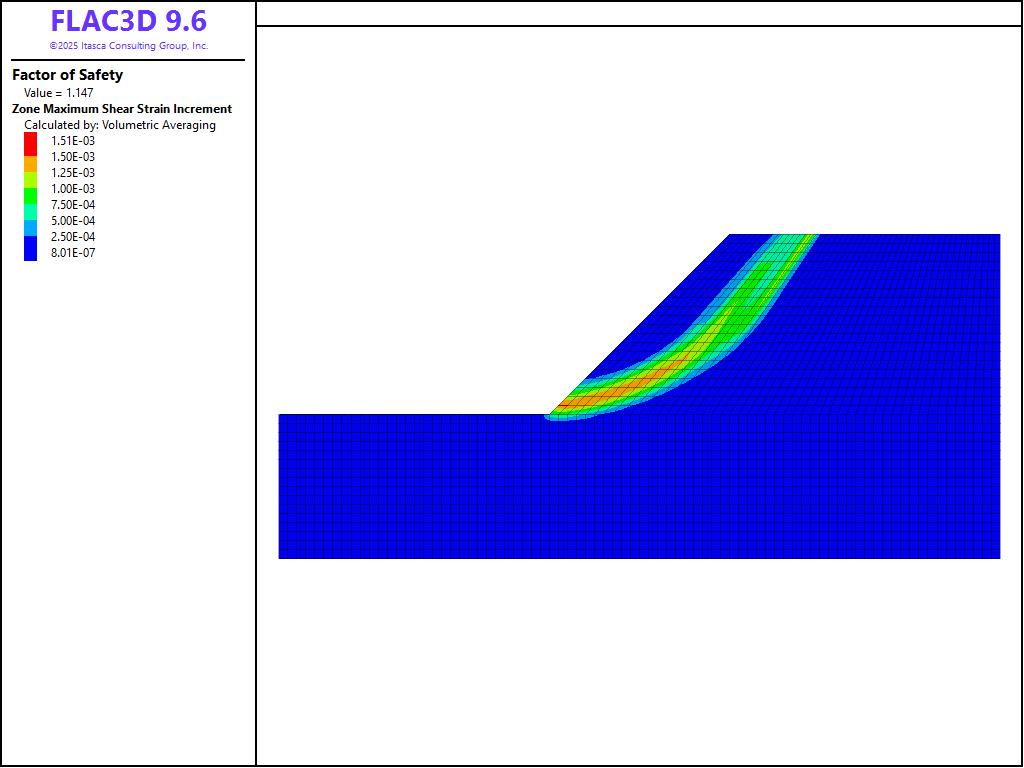 The FLAC3D model mesh used for this test is shown in Figure 1. By default, when model factor-of-safety is executed for a FLAC3D model with zone cmodel assign hoek-brown, the factor of safety calculation is performed for Hoek-Brown material with respect to shear strength. The calculated factor of safety for this test is 1.15. The failure surface is shown by the shear strain contour plot in Figure 2. The result compares well with the results reported by Hammah et al. (2005). Table 2 summarizes the safety factors reported for this test.