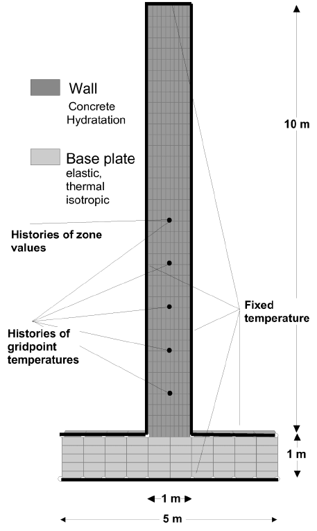 The thermal hydration model (hydration) and the mechanical hydration Drucker-Prager model (hydration-drucker-parger) are prescribed for the concrete wall. The base plate is considered elastic and thermally isotropic.