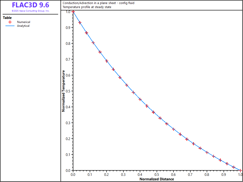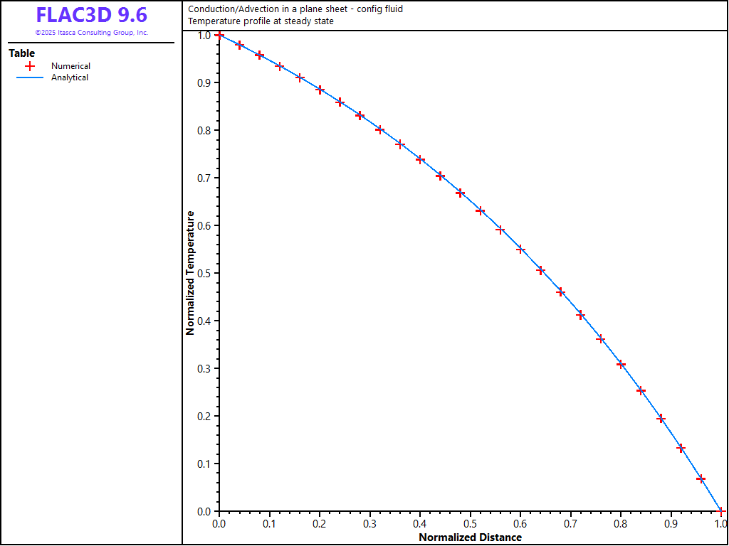 The FLAC3D temperature profile for convection-conduction is compared to the analytical solution at steady state in Figure 3 and Figure 4. As can be seen from these figures, the match is very good for this particular simulation.