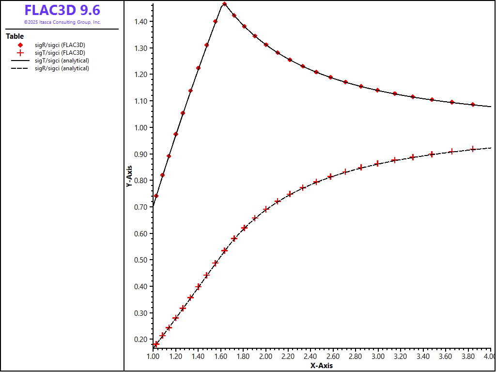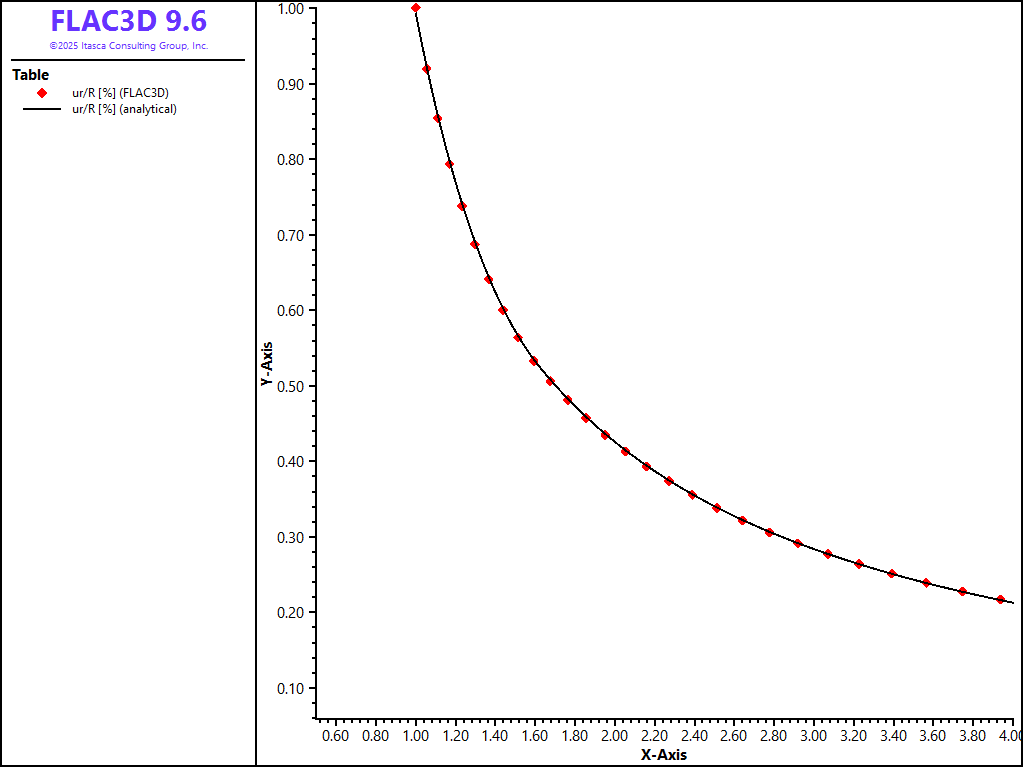 Figure 2 shows the radial and tangential stresses calculated by FLAC3D compared to the analytical solution for \(\sigma_r\), and \(\sigma_\theta\). Figure 3 compares radial displacement, \(u_r\). The agreement is very good in both comparisons.