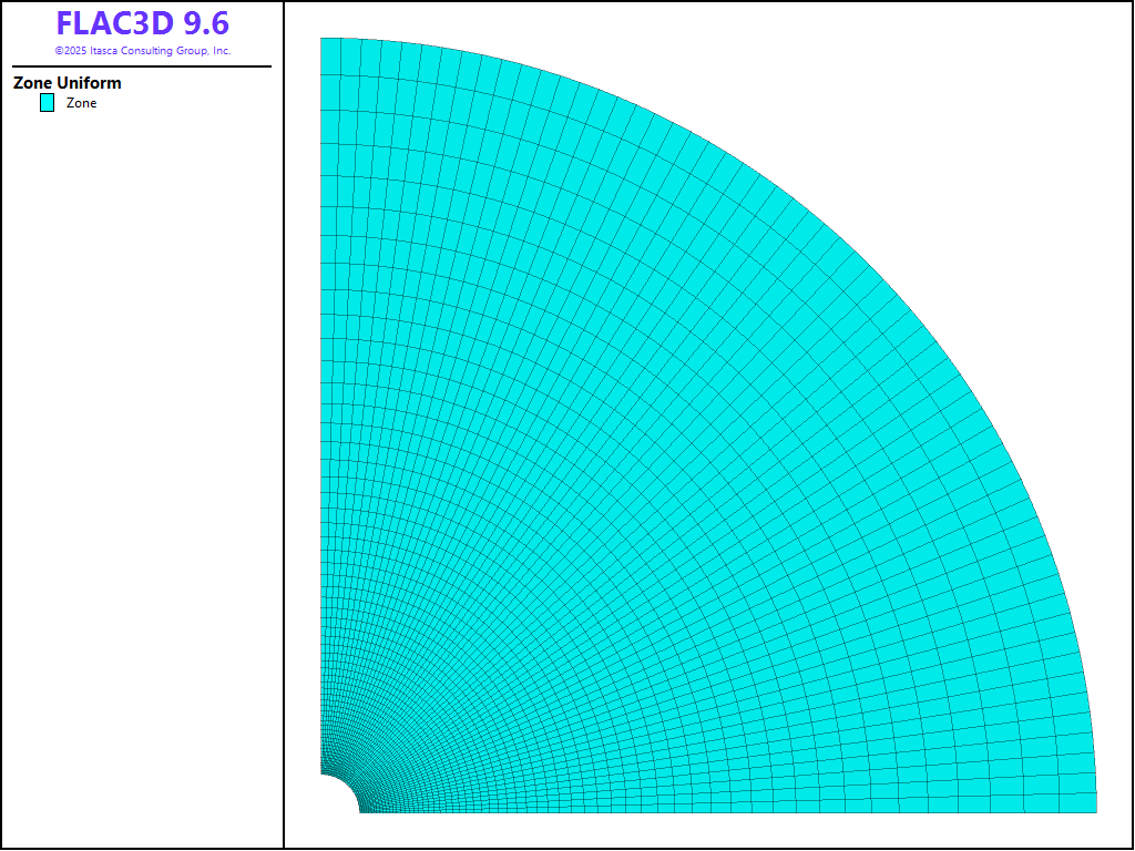 The FLAC3D model created for this problem is a plane-strain model with the plane of analysis oriented normal to the axis of the hole. Only a quarter of the problem needs to be analyzed, because of symmetry. The grid is shown in Figure 1. As the figure indicates, it is a radially symmetric mesh with increasing zone size away from the hole. The grid contains 3600 zones, and the boundary is located at 20 radii from the center of the hole. The constitutive model used for the simulation is the Hoek-Brown-PAC model.