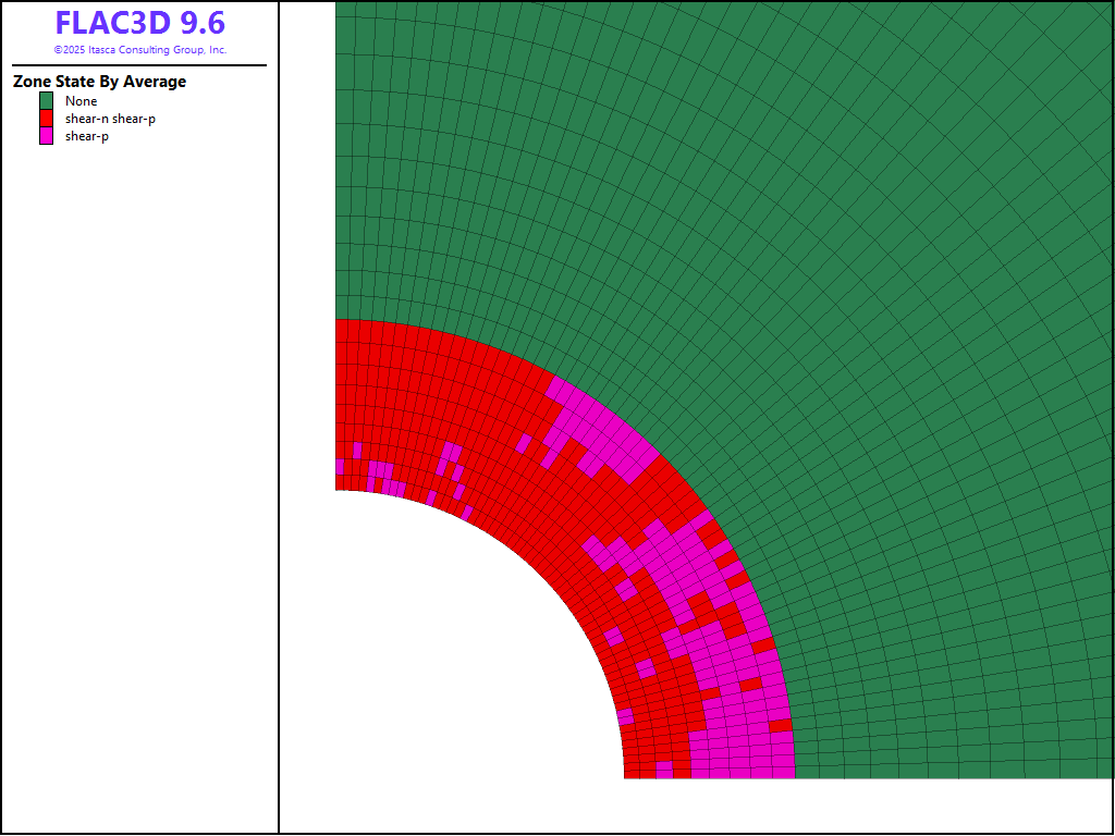A plot of the Hoek-Brown failure envelope is shown in Figure 4. Zone stresses are shown on this plot and indicate the extent of the failed zone. Figure 5 displays the zone plasticity indicators, which also indicate the extent of the failure region. This corresponds to the analytical solution of 3.2 m (1).
