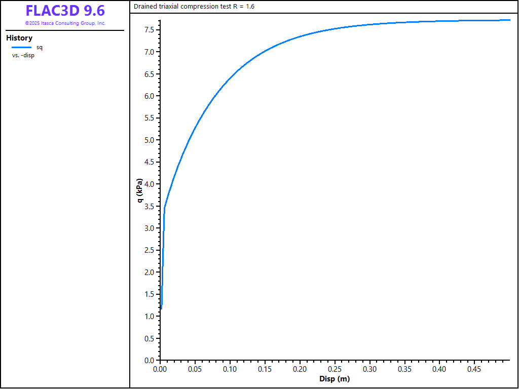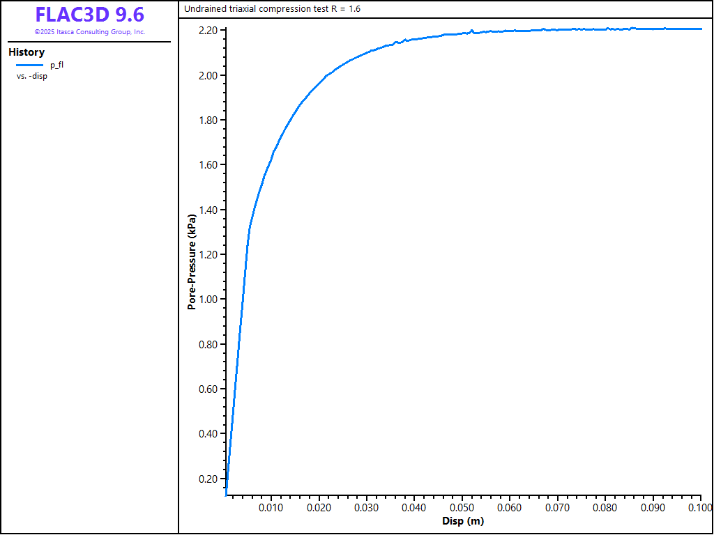 The numerical tests are carried out using one single zone with unit dimensions. The grid is fixed in the \(z\)-direction, and a velocity boundary condition applied at the top of the model. An initial isotropic compressive stress of 5 × \(p'_1\) is prescribed, and a constant lateral confining pressure \(p_0 = 5 \times p'_1\) is imposed in the \(x\)- and \(y\)-directions. To run the undrained examples, the fluid configuration is selected and flow calculations are turned off.