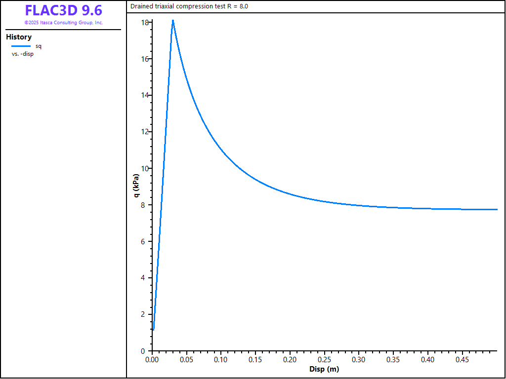 Figure 13: Evolution of deviator stress with axial strain for R = 8—drained test.