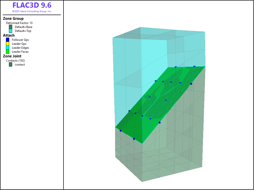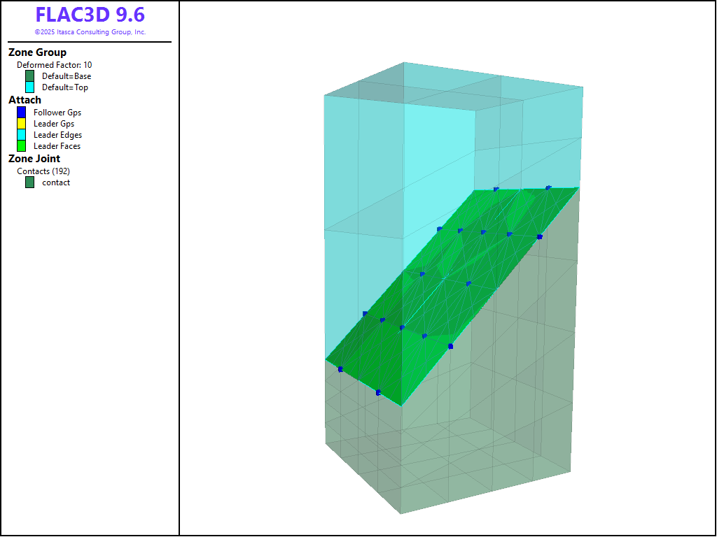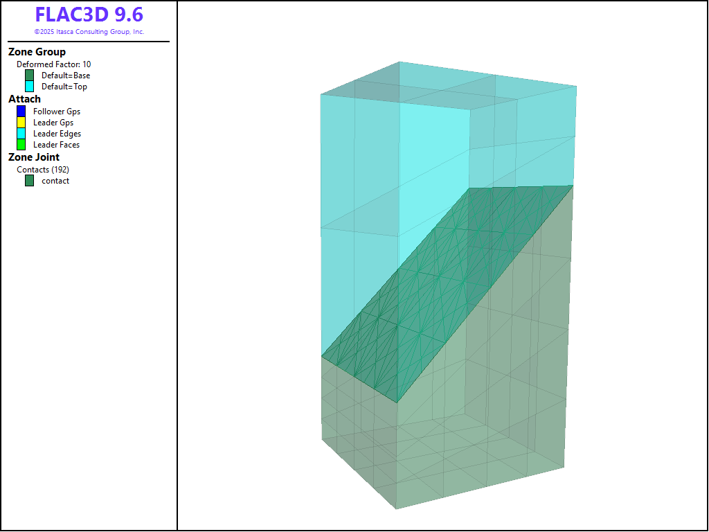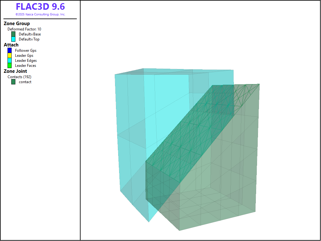 To view this project in FLAC3D, use the menu command . Choose “FLAC/ ZoneJoint/ ZoneJointWithAttach” and select “zonejointwithattach.prj” to load. All data files are found in the project.