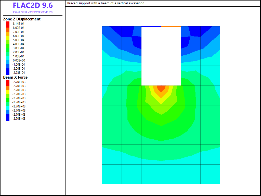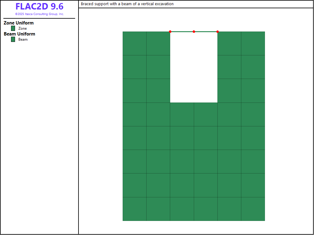 This example examines a trench that is supported with one strut bracing the excavation walls at the top. The following command sequence is for the simple case in which the brace is placed immediately upon excavation. The strut is represented as a single beam composed of two elements, and is created using the structure beam create by-line command. Use of this command ensures that the two ends of the beam are attached to the grid such that the translational degrees-of-freedom are rigidly connected and the rotational degrees-of-freedom are free.