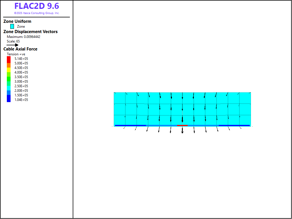 In the previous model, the grout cohesive strength was set to a very large value to prevent grout failure. If we set the grout cohesive strength equal to 1.5 × 105 N/m and rerun the model, we find that the system still stabilizes; however, during the loading process, the grout yields (cable slips) in the middle region (see Figure 4). The grout stress in this region is equal to the grout cohesive strength (see Figure 5), the tensile force is distributed farther along the cable (compare Figure 2 and Figure 6), and the maximum vertical centerline displacement has increased from 9.66 mm to 11.1 mm.