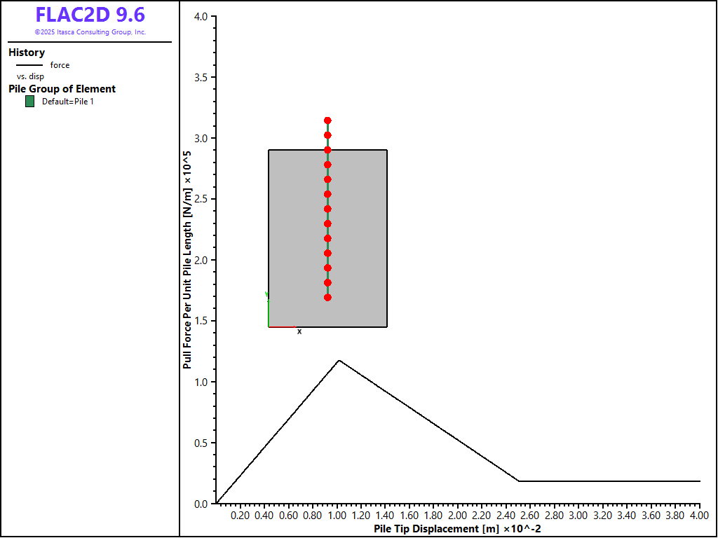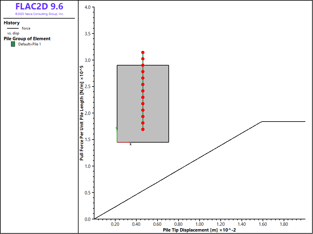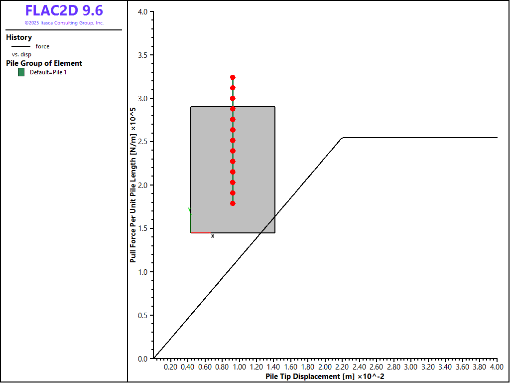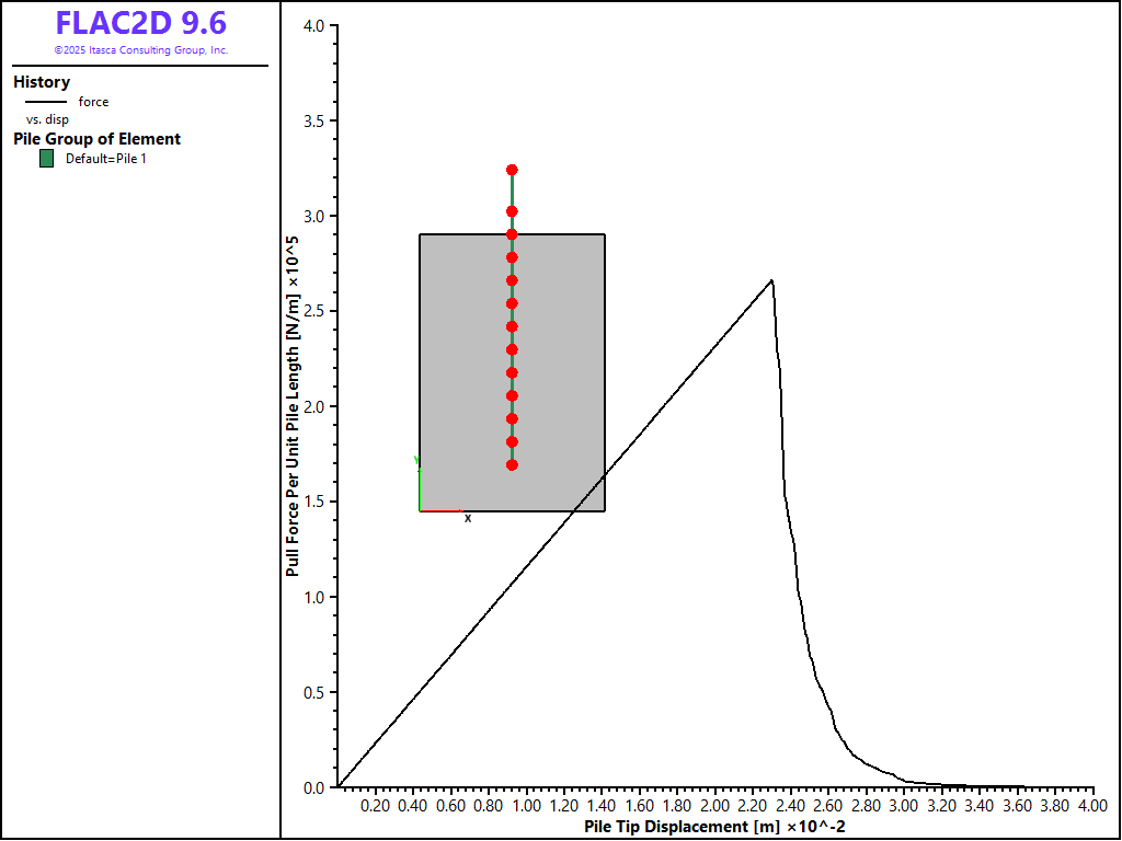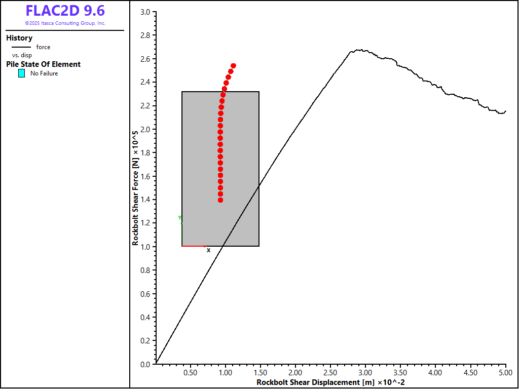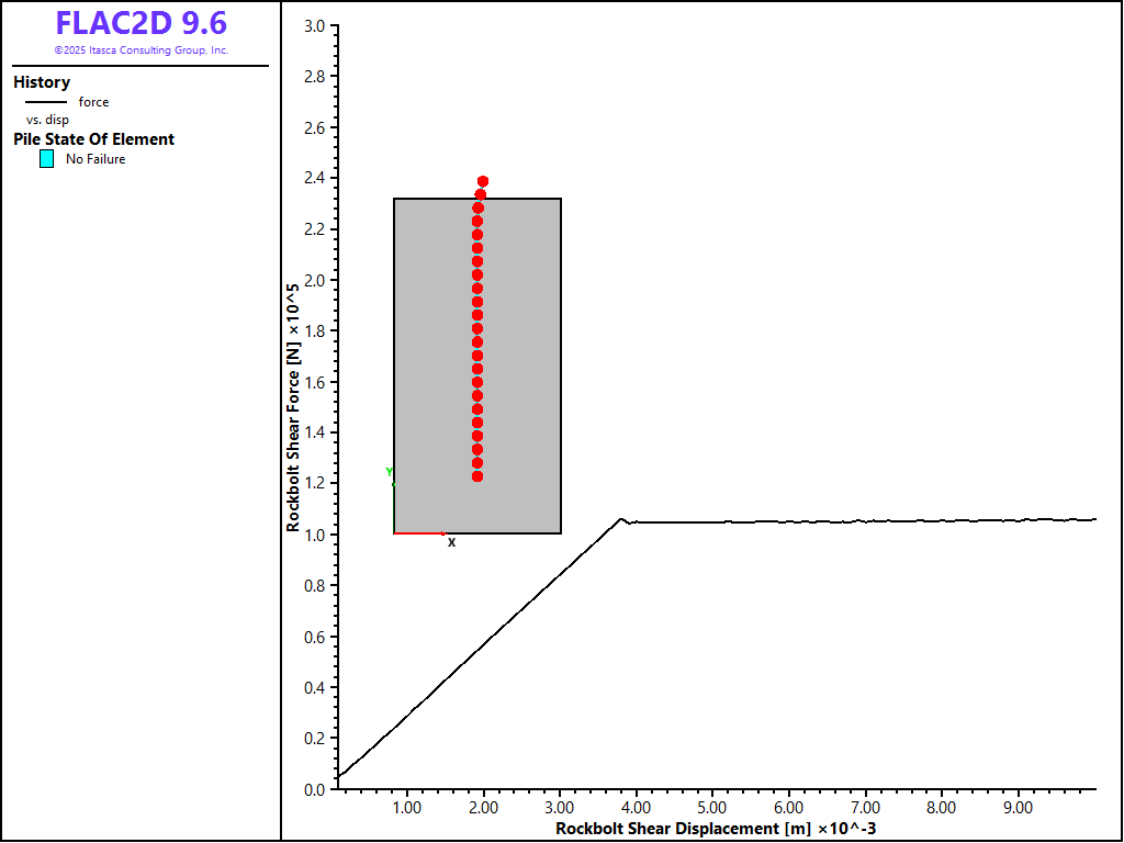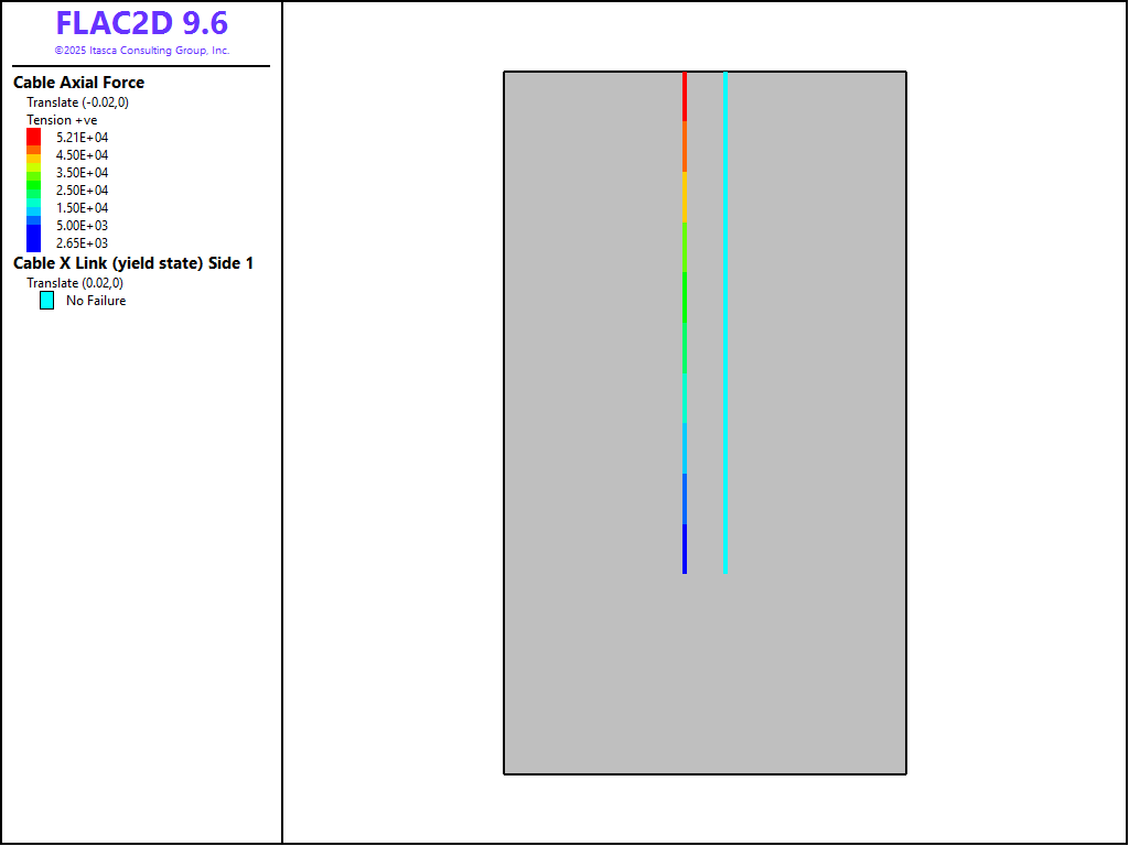 The data file “Pulltest08.dat” sets up a model that considers a limiting tensile force of 1.5 × 105 N and a limiting axial strain of 1 × 10-4. The results from this model are shown in Figure 14. The diagram shows that the limiting tensile force is reached after a pull-out displacement of approximately 2.6 cm. Note that after this limiting force is reached, the pull-out force rapidly decreases to zero, indicating the rupture of the rockbolt.