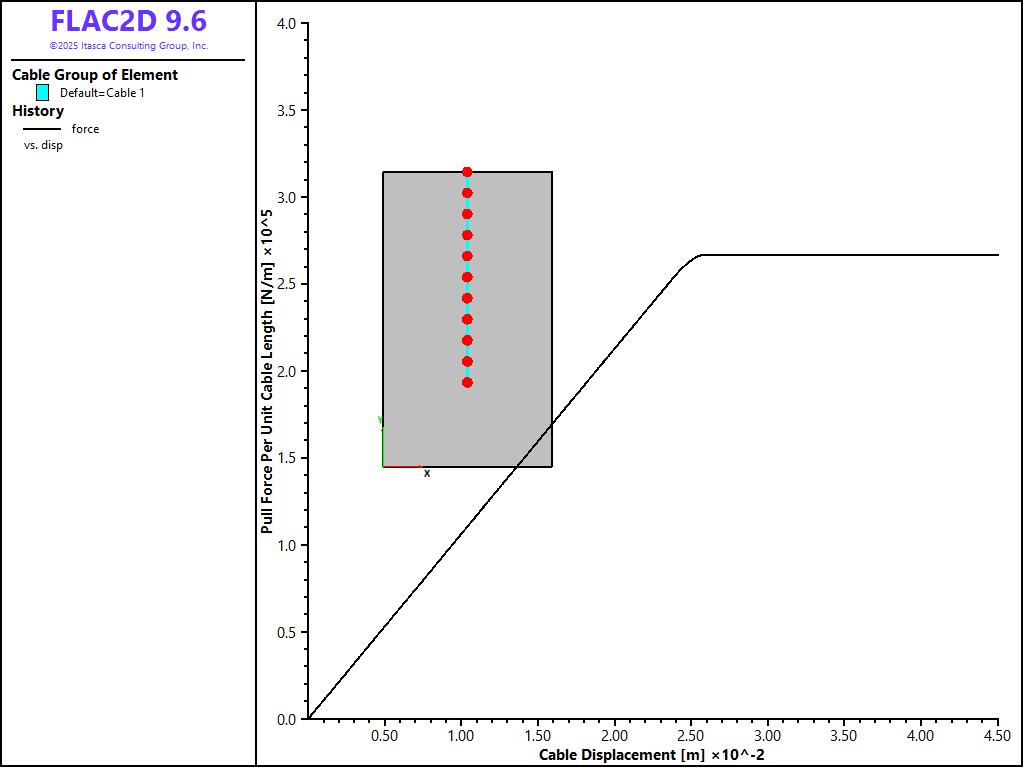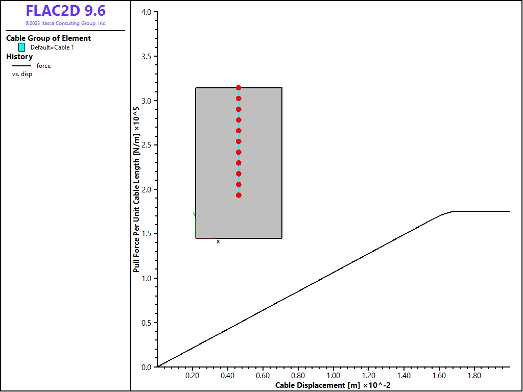 The data file “Pull01.dat” is a simple representation of a pull-test using FLAC2D. The cable end-node is pulled at a small, constant \(y\)-oriented velocity—see Figure 2. A FISH function is used to sum the reaction forces and monitor nodal displacement generated by the pull-tests for comparison to field test results.