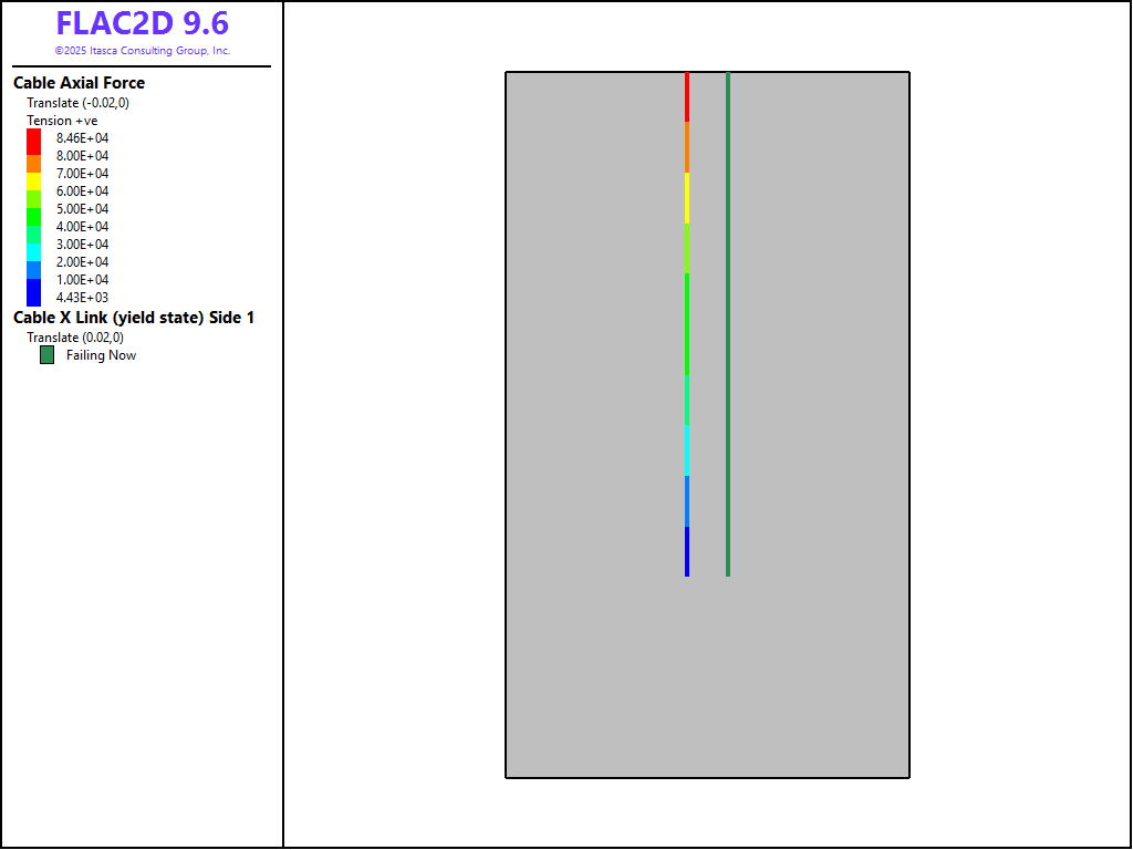 Figures 4 to 6 show the axial force distribution on the cable for displacements of 10 mm, 16.5 mm, and 17.5 mm, respectively. Note that cable-bond slip progresses rapidly after peak strength is reached at the first cable element. Superimposed on the axial forces are locations at which the grout bond is yielding. At 10 mm (Figure 4), the grout bond has not failed. At 16.5 mm (Figure 5), bond failure is initiated and rapidly propagates (Figure 6) down the entire cable length. At that stage, the force on the cable end is simply the sum of grout_cohesion × \(l_i\) (where \(l_i\) is the length of cable segments) for all \(n\)-slipping segments. If the embedded length were long enough, the cable axial force would eventually reach the yield force of the cable itself. The cable should then break when the extension strain equals the ultimate breaking strain of the cable (generally around 3%). See Pull-Test with Tensile Rupture.