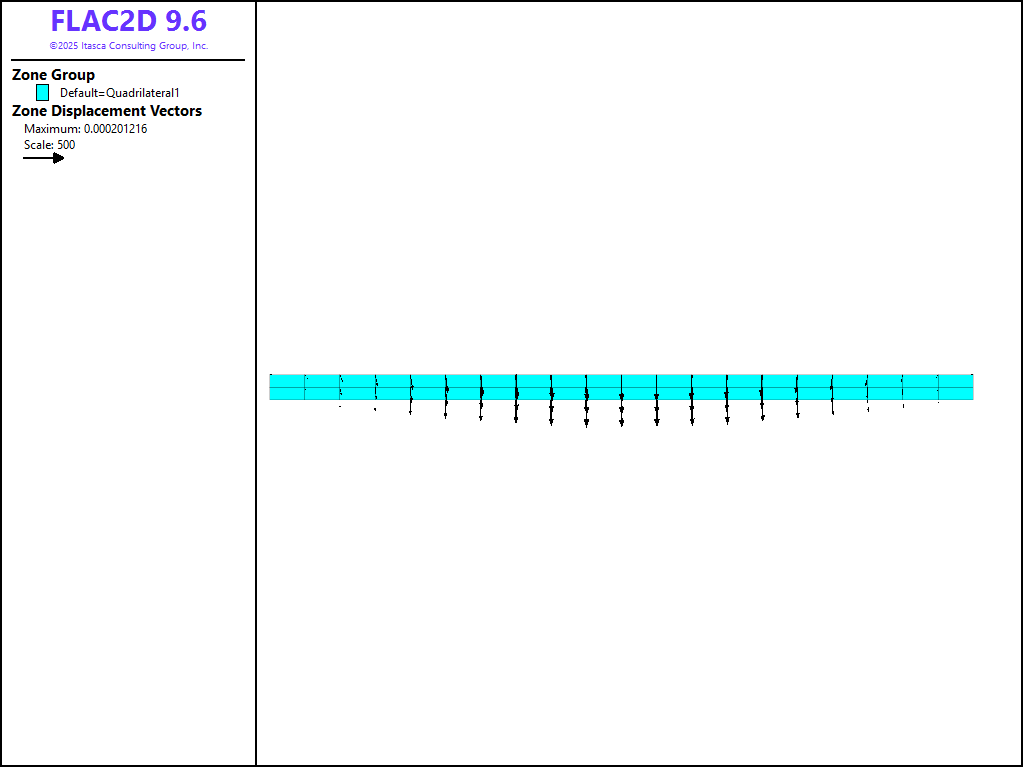 A simply supported wooden beam (\(E\) = 8.6 GPa, \(\nu\) = 0, length of 2.5 m, height of 90 mm) has a concentrated load of 2000 N applied at its center. The beam is modeled with 40 FLAC2D zones. (Note that more zones are required to obtain the correct beam-theory solution. The system, as modeled, is too stiff; however, it is sufficient for the present example.) The FLAC2D model and the displacement field are shown in Figure 1.