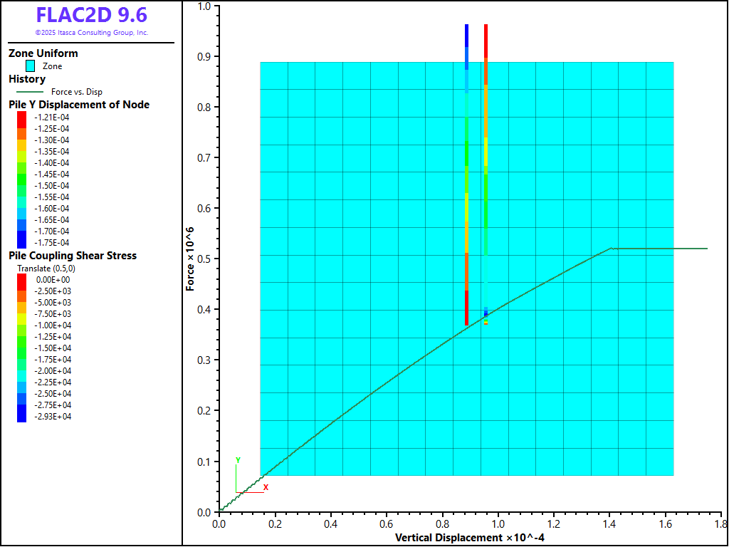 To illustrate the effect of end-bearing capacity, we first consider the case corresponding to a friction pile in sand (see the data file at the end of the example). The pile and grid geometries are similar to those in the Skin Friction example. Here the property \(c_s\) is set to zero and the pile friction (\(\phi_s\)) to 10 \(^{\circ}\), so that the pile shear strength is generated by confining pressure according to the shear behavior of the pile-grid boundary. A downward velocity is applied at the pile top, and the top force and vertical displacement are monitored for a total of 20,000 steps.