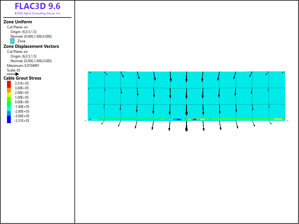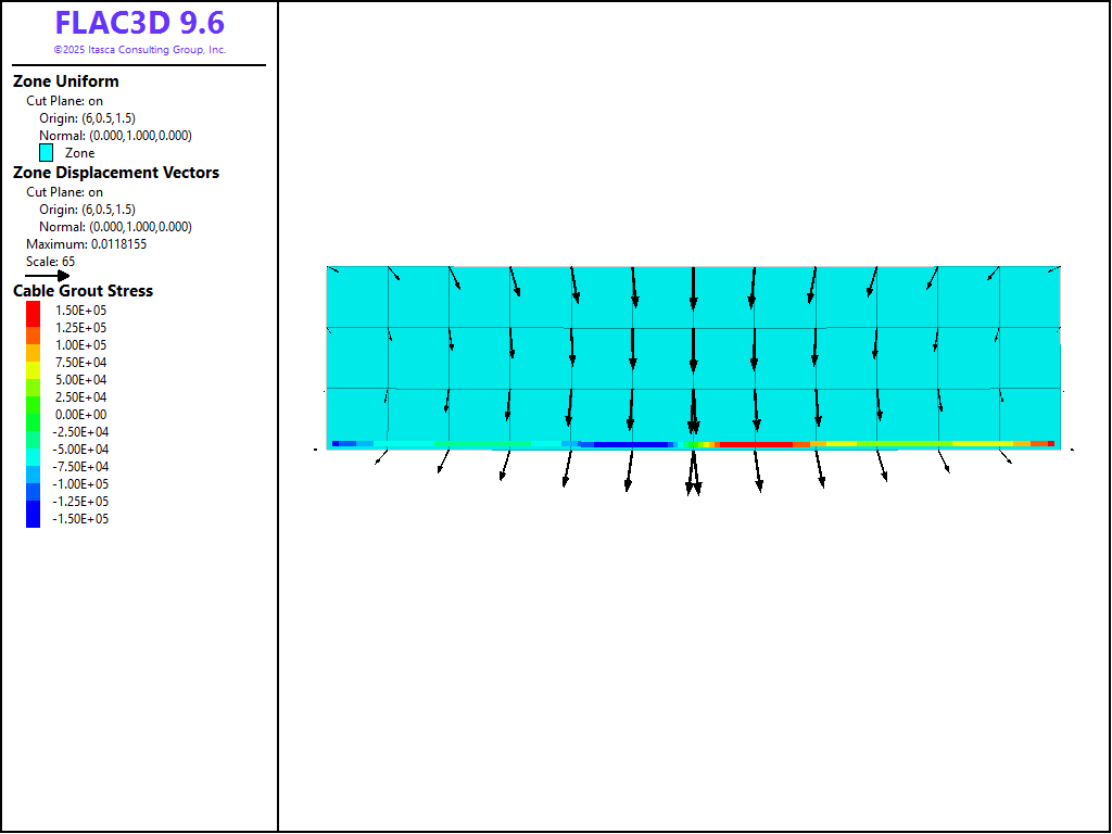To view this project in FLAC3D, use the menu command . Choose “Structure/Cable/ReinforcedBeam” and select “ReinforcedBeam.prj” to load. The main data files used are shown at the end of this example. The remaining data files can be found in the project.