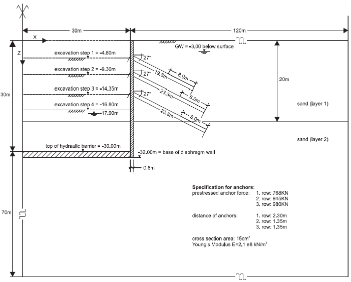 The linear elastic properties for the diaphragm wall are given in Table 2, and the anchor specifications are listed in Table 3.